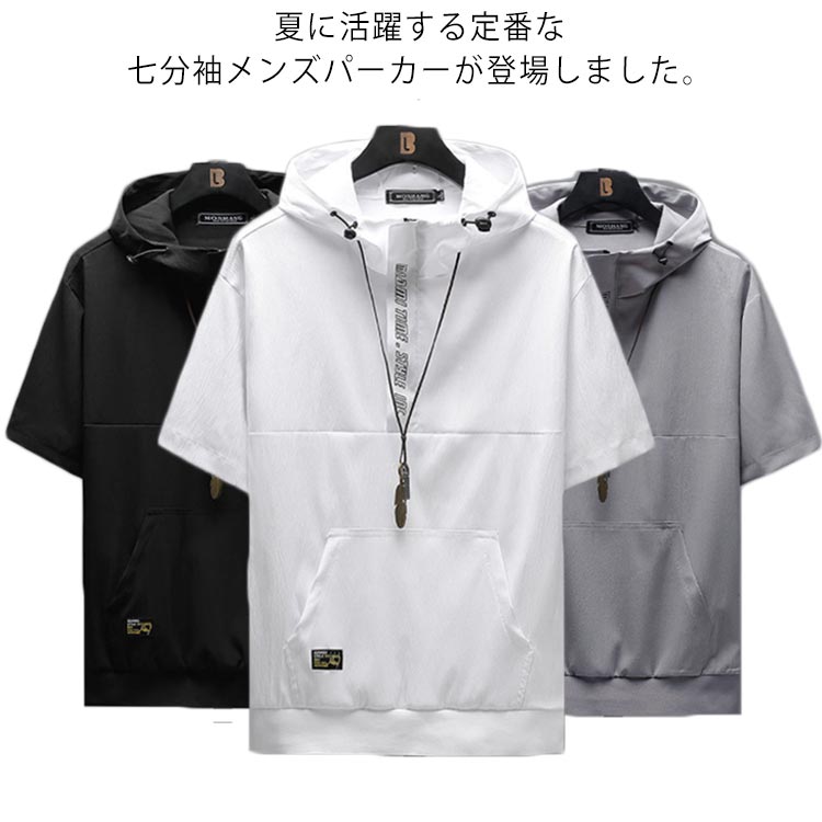 メンズ パーカー 7分袖 夏服 フード トップス パーカー 新登場! ブラック(6007) ホワイト(6007) グレー(6007) M L XL 2XL 3XL