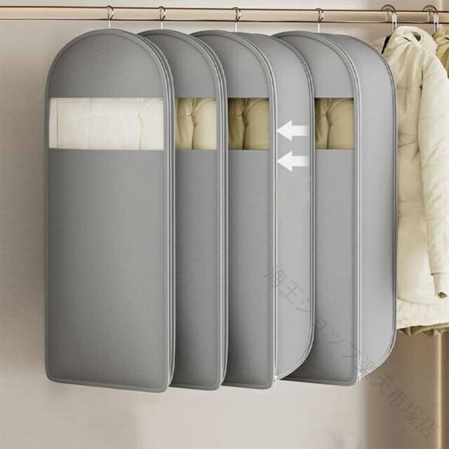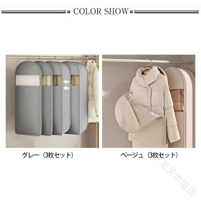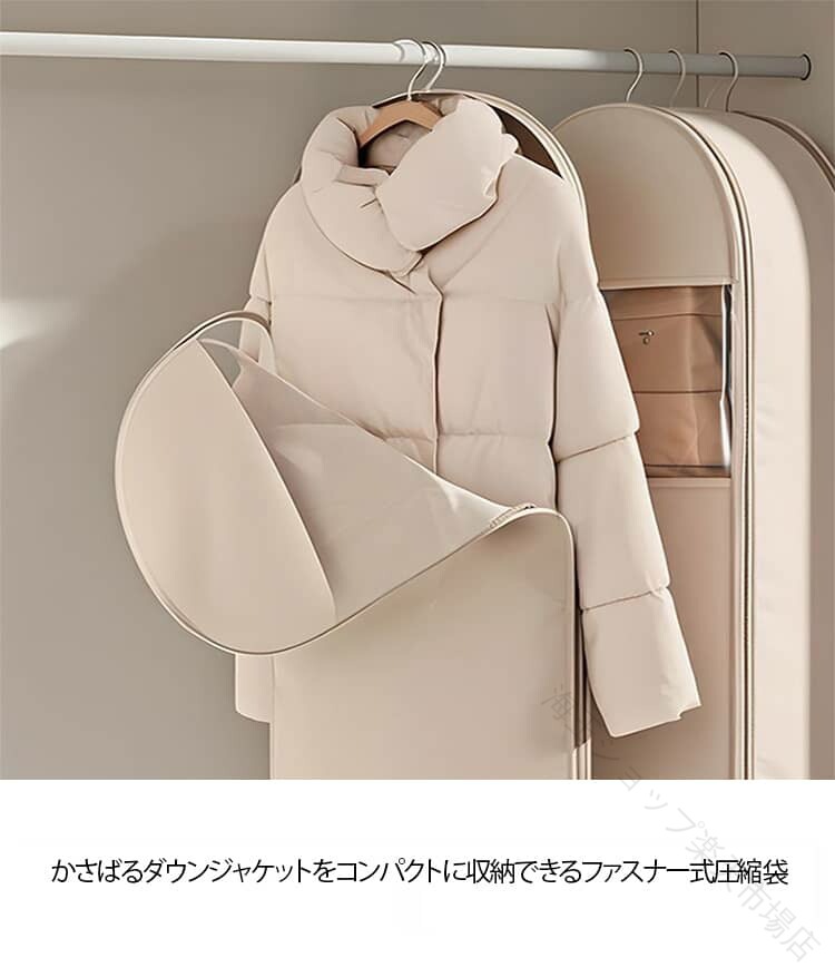 .3点セット の 衣類圧縮袋 と 衣類カバー は ジャケット や ダウンジャケット、ダウンコート、コート の 収納 に最適 です。ファスナー式 で 吊り下げ 可能 な ロング サイズ の 圧縮バッグ は ほこりよけ 機能 付き で 洋服収納袋 として 整理 と 保管 に便利 です。無地 の シンプルな デザイン で 幅広い 衣類 に 対応 します。。