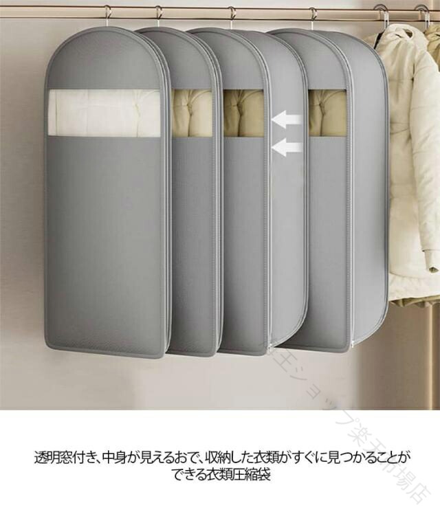 ダウンを傷めず、約40%スペース節約♪・2枚セットかさばるダウンジャケットをコンパクトに収納できるファスナー式圧縮袋。一部の生地が透明になっているので、何を入れたか一目でわかります。ポンプや掃除機が不要で、ファスナーを閉めるだけで、手軽に圧縮できる吊るせる圧縮袋。吊り下げ圧縮袋はコートやロングコート、ジャケット等の洋服をスッキリ収納。透明窓付き、中身が見えるおで、収納した衣類がすぐに見つかることができる衣類圧縮袋。1つの吊るせる圧縮袋に約3-5枚のコートやジャケットを収納できる。吊り上げ圧縮袋は縦のスペースを利用、クローゼット内の収納スペースがぐっと広がる。使わないときは折りたためるのでスペースをとりません。出張、旅行などのアウトドアにもご利用いただけます。