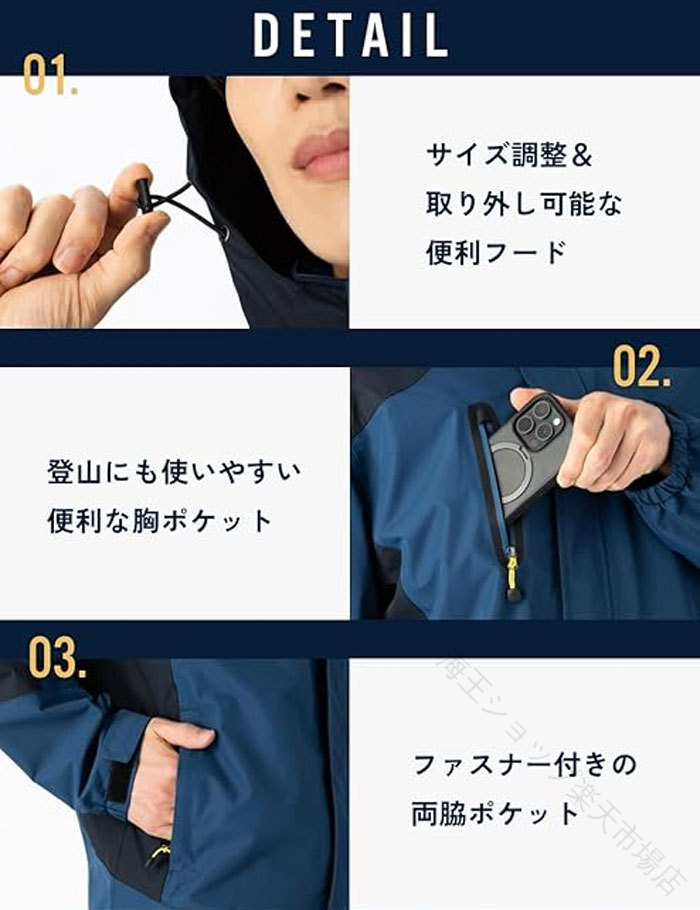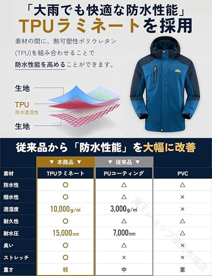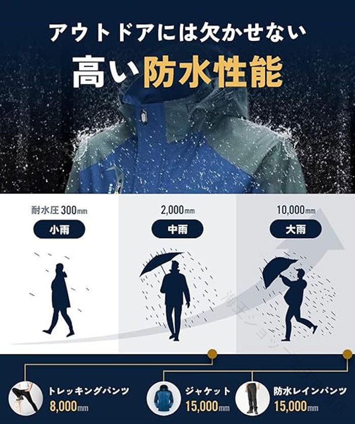 .マウンテンパーカー 上下 セット は 耐水圧 7000mm の 撥水 性能 と 防風 機能 を 備えた メンズ 用 レインジャケット と レインスーツ です。登山 や 釣り、バイク など アウトドア 活動 に最適 な 防寒 裏起毛 製で 快適 な 着心地 を 提供 します。。