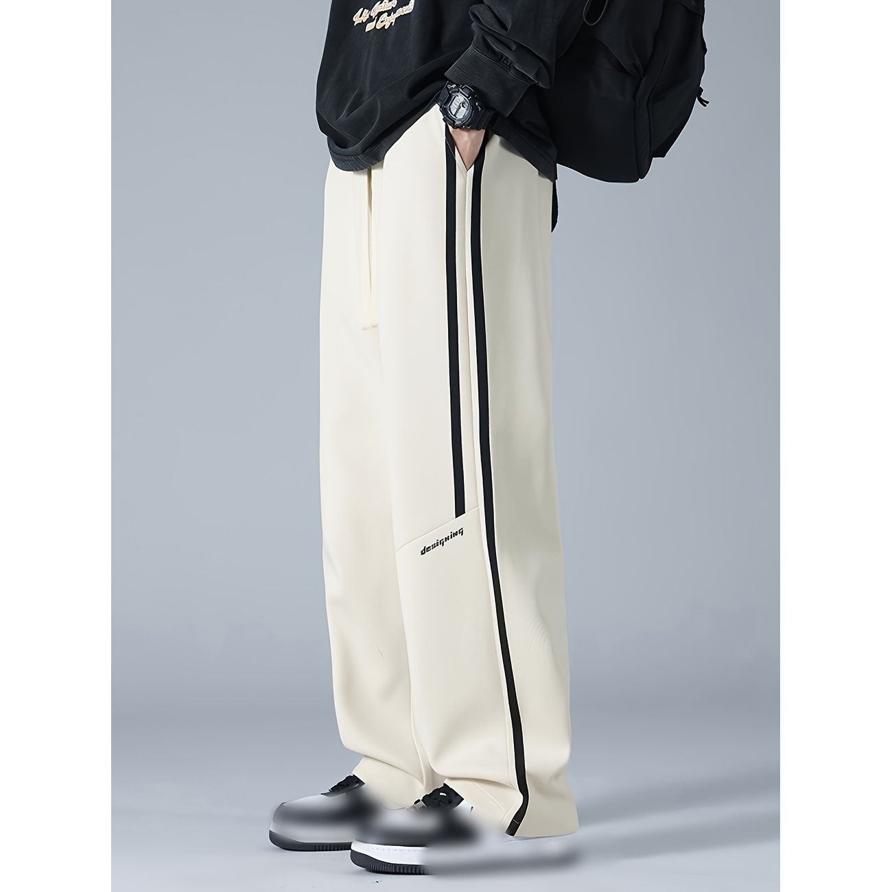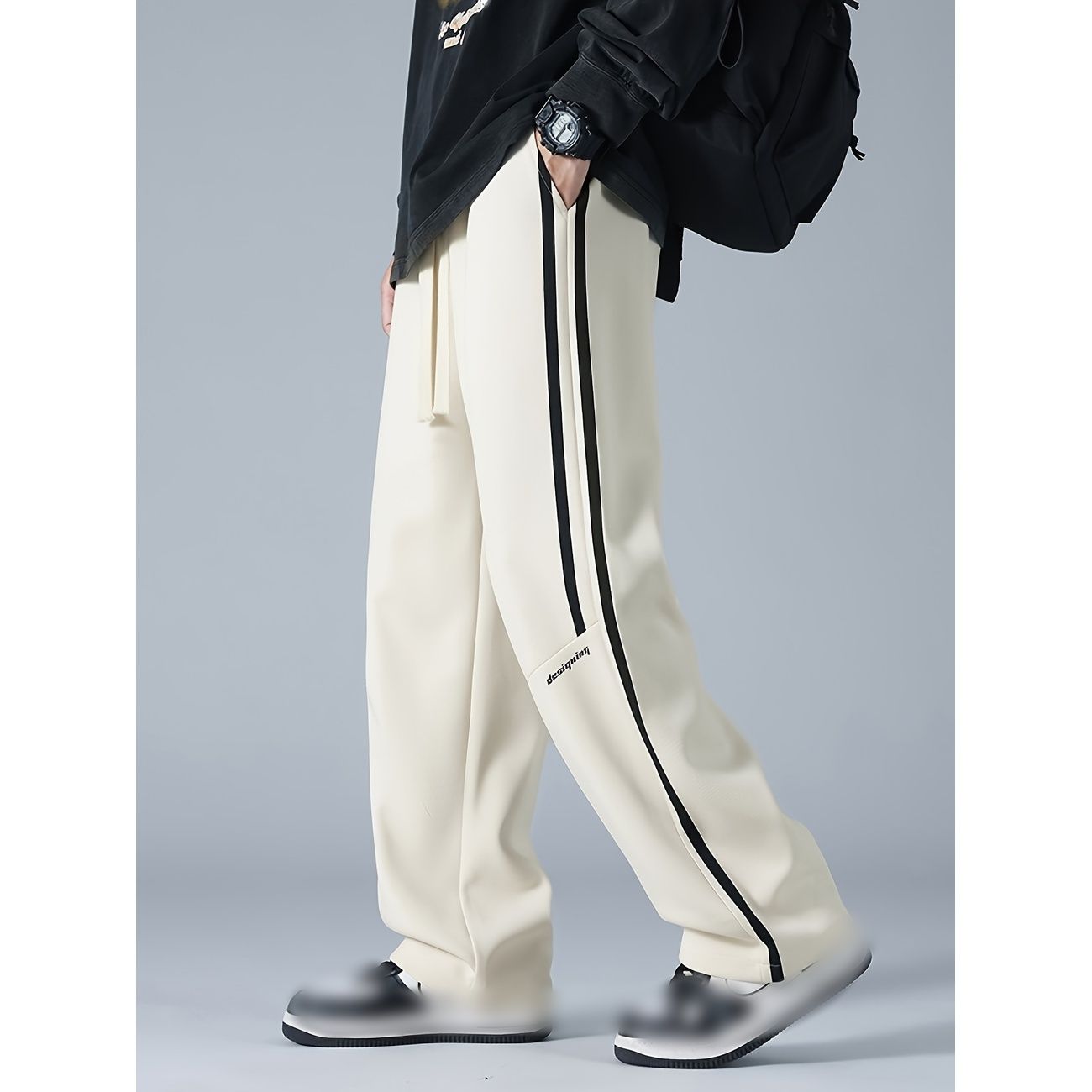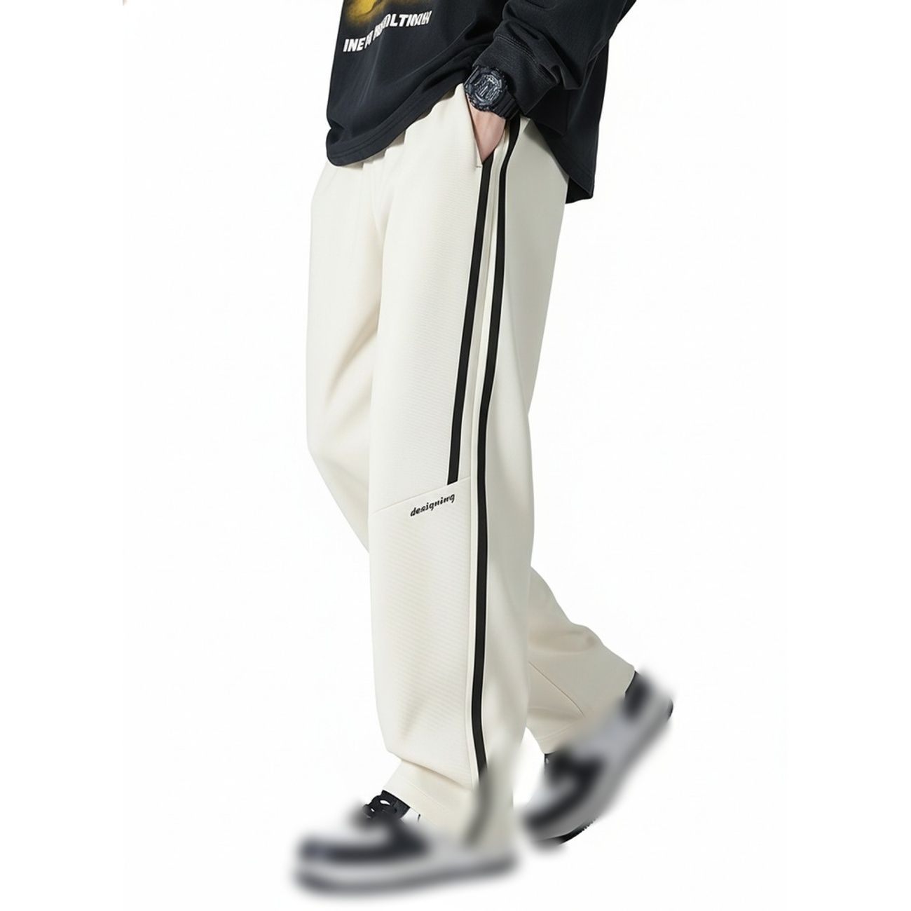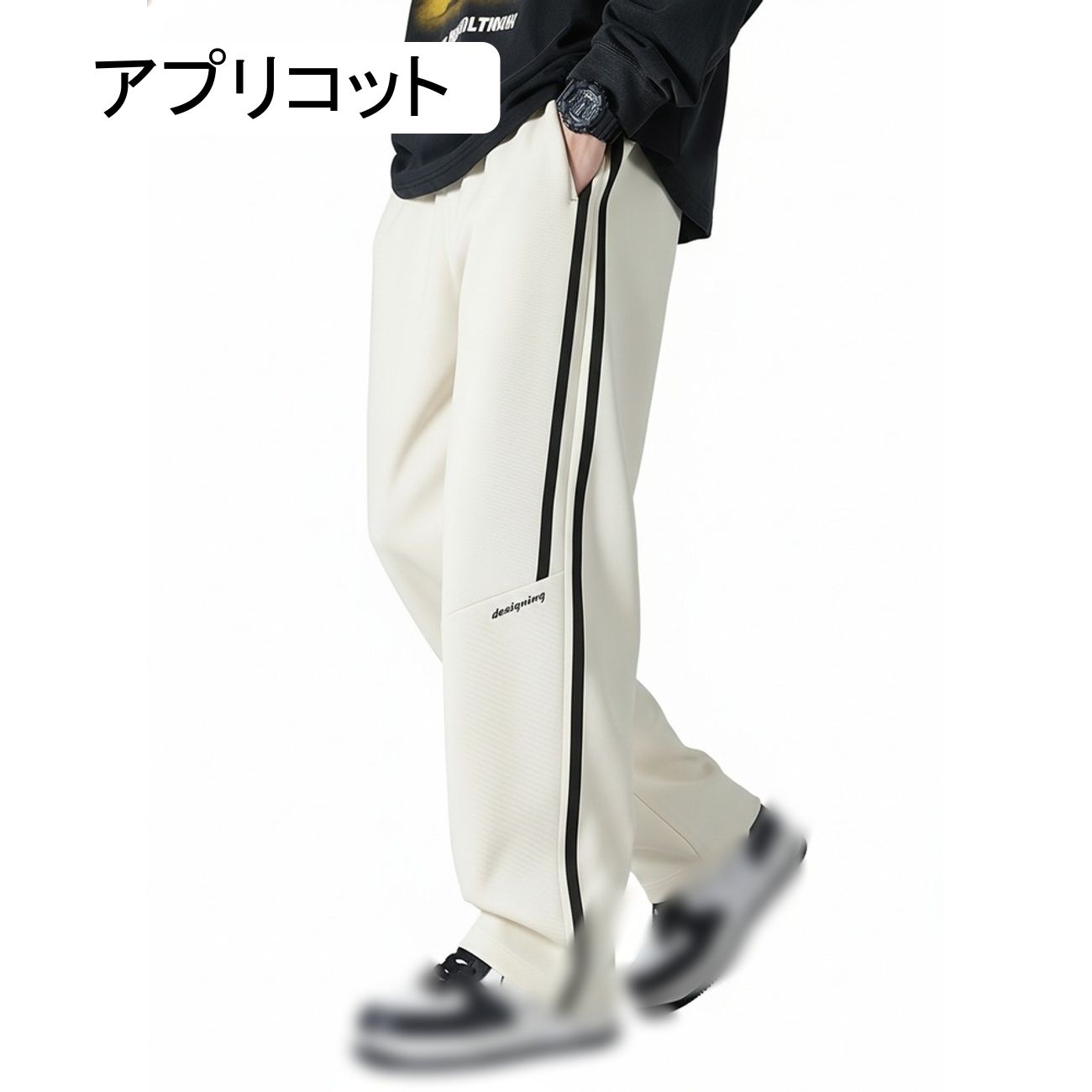 ◆【スタイリッシュなデザイン】サイドラインが際立つこのメンズパンツは、美シルエットを実現するワイドパンツです。アイボリーの絶妙な色合いと洗練されたサイドラインパンツのデザインが、都会的なストリート感を演出します。シンプルなロゴがアクセントになり、穿くだけでおしゃれな雰囲気を醸し出す魅力的な一本です。