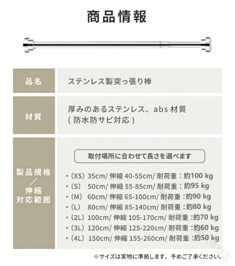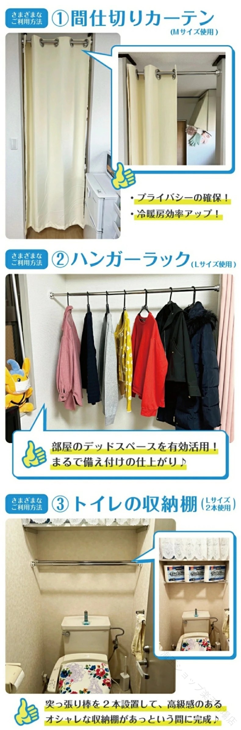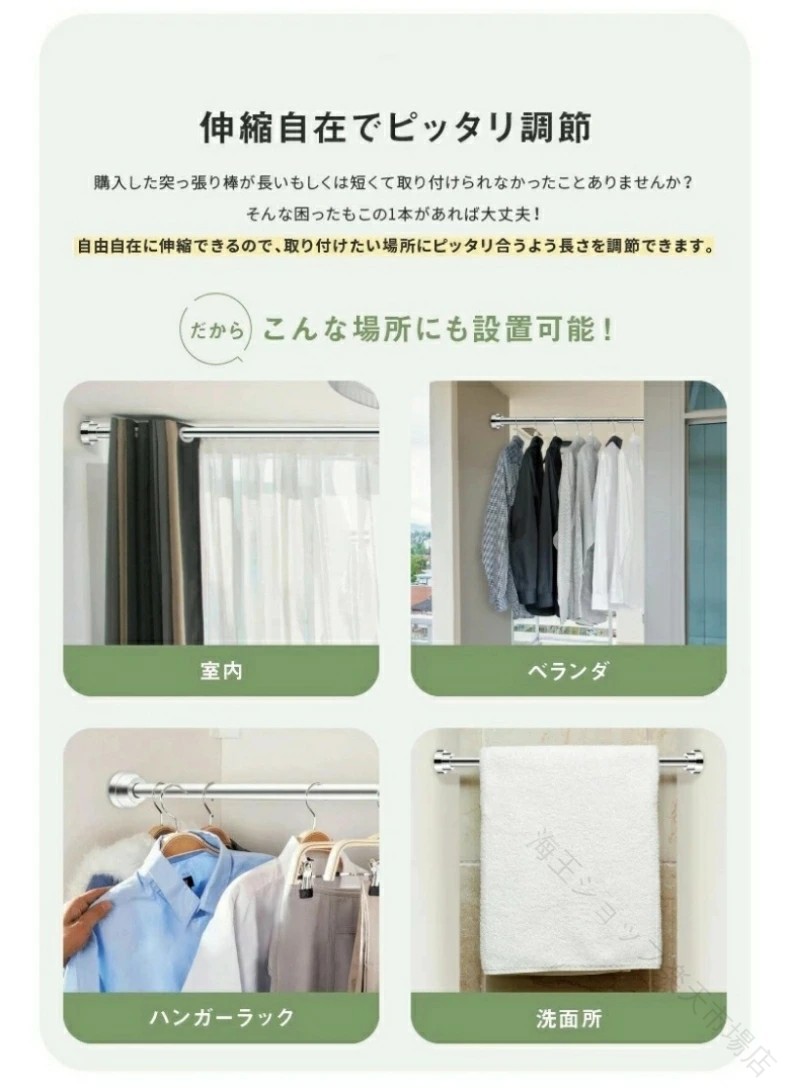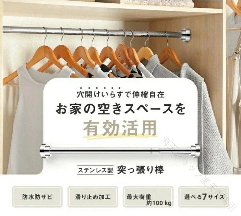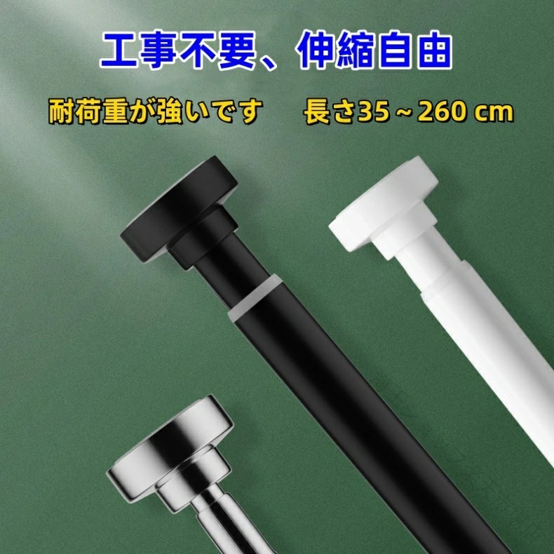.突っ張り棒 は 伸縮自在 40cm から 260cm まで 調整可能 な ステンレス 製 の 強力 耐荷重 タイプ です。 カーテン や 衣類、 棚 の 収納 用 として ベランダ や リビング、 洗面所、 トイレ、 お風呂、 浴室、 玄関、 クローゼット、 押入れ、 布団干し まで 幅広い 使用シーン に 対応 し、 省スペース で 多機能 な 物干し として 活躍 します。。
