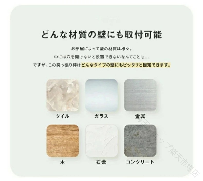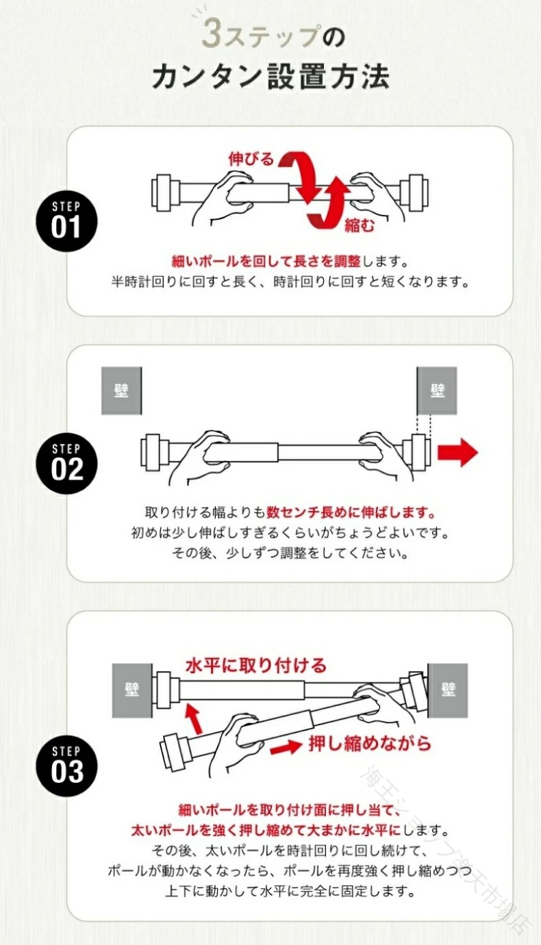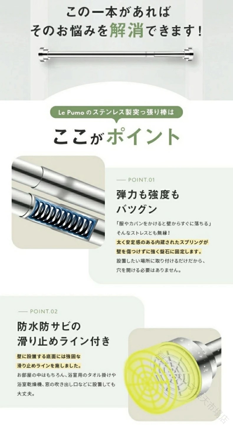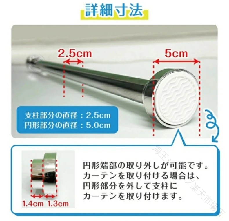 .突っ張り棒 は 伸縮自在 40cm から 260cm まで 調整可能 な ステンレス 製 の 強力 耐荷重 タイプ です。 カーテン や 衣類、 棚 の 収納 用 として ベランダ や リビング、 洗面所、 トイレ、 お風呂、 浴室、 玄関、 クローゼット、 押入れ、 布団干し まで 幅広い 使用シーン に 対応 し、 省スペース で 多機能 な 物干し として 活躍 します。。
