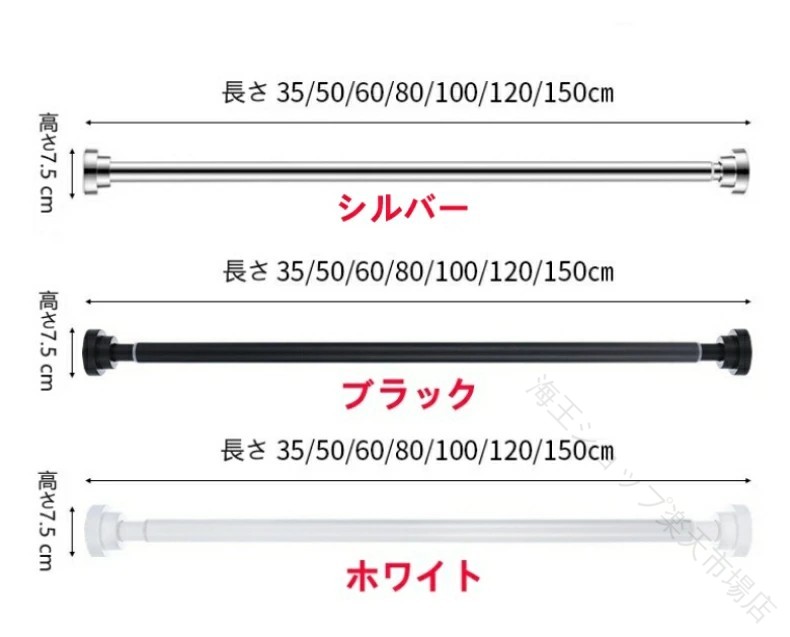 突っ張り棒 伸縮自在 40cm~260 シルバー ブラック ホワイト 35cm(伸縮範囲約40cm~55cm) 50cm(伸縮範囲約55cm~85cm) 60cm(伸縮範囲約65cm~100cm) 80cm(伸縮範囲約85cm~140cm) 100cm(伸縮範囲約105cm~170cm) 120cm(伸縮範囲約125cm~220cm)