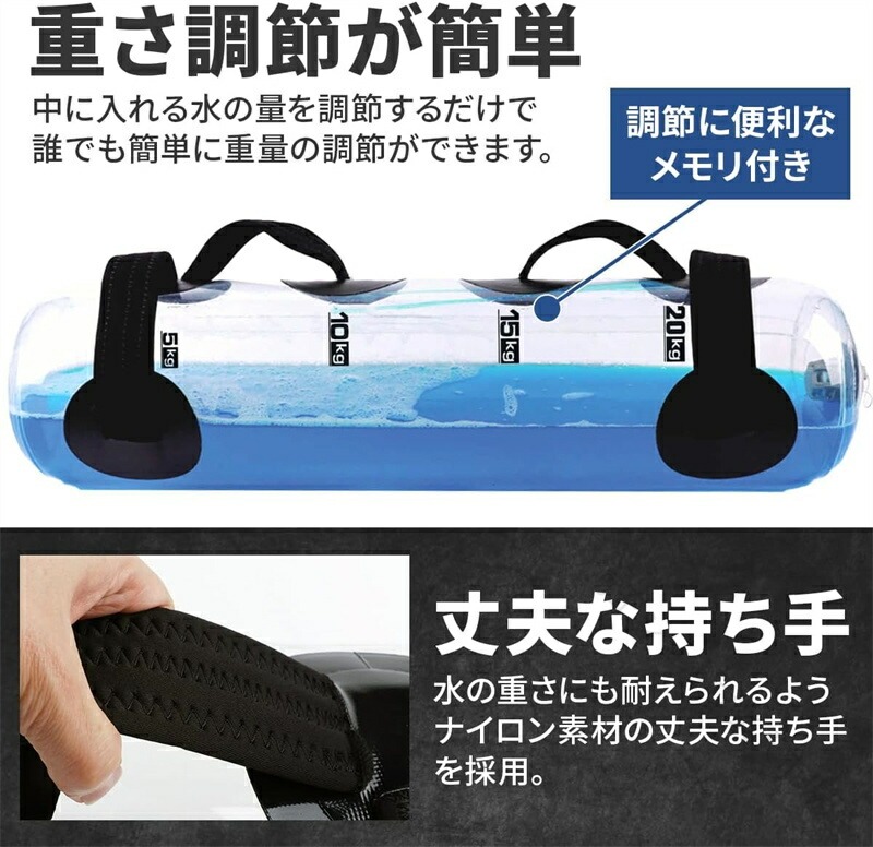 透明5kg、透明10kg、透明15kg、透明20kg、透明25kg、透明30kg、透明35kgサイズ(約):透明5kg【28cm×15cm】、透明10kg【58cm×15cm】、透明15kg【63cm×19cm】、透明20kg【73cm×19cm】、透明25kg【73cm×20.5cm】、透明30kg【73cm×24cm】、透明35kg【80cm×23cm】素材:PVC重心が移動するので今まで以上に鍛えられる!通常のダンベル等とは違い、水が左右に揺れるので体幹トレーニングに使用することができます。水量を変えて自分に合った負荷でトレーニング! ダンベルと違い、常に自分のベストな重さに調整可能。軽い運動から競技力を高めるための本格的なスポーツトレーニングにも対応。また何個もダンベルを持つ必要もありません。体幹強化はもちろん、様々なトレーニングに対応出来るようグリップが複数ついています。これ一つで複数のトレーニング&体幹強化まで行えます。通常のダンベルのように持ち上げるだけでなく、バーベルとして肩に載せてスクワットに利用したり、各部位の集中的なエクササイズも可能。腕や脚など気になる部位にピンポイントに利用したり、おなか周りや背筋強化などにも利用できます。【重さを調節できる】ウォーターバックは水を利用した筋トレ器具であるため、自分の体力にあわせて重さを調整することができます。陸上やサッカー、ラグビー、野球などさまざまな部活動、クラブチームにも愛用されております。重さは水の量を調整して、10kg(10L) 20kg(20L) 30kg(30L) 最大35L~36Lまで増やせます。※簡易包装となりますのでご理解の程よろしくお願いします。※手動測定による1~3cmの測定偏差を許容してください。※モニターや光の効果が異なるため、実際の色は写真の色と若干異なる場合があります。※仕様・デザインは改良のため予告なく変更することがあります。