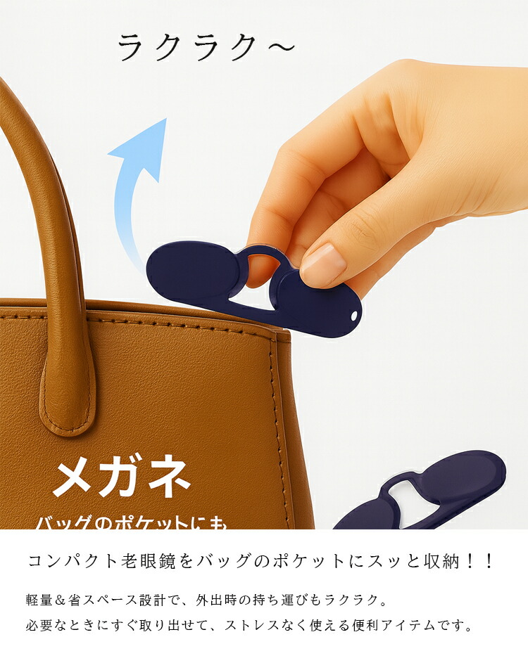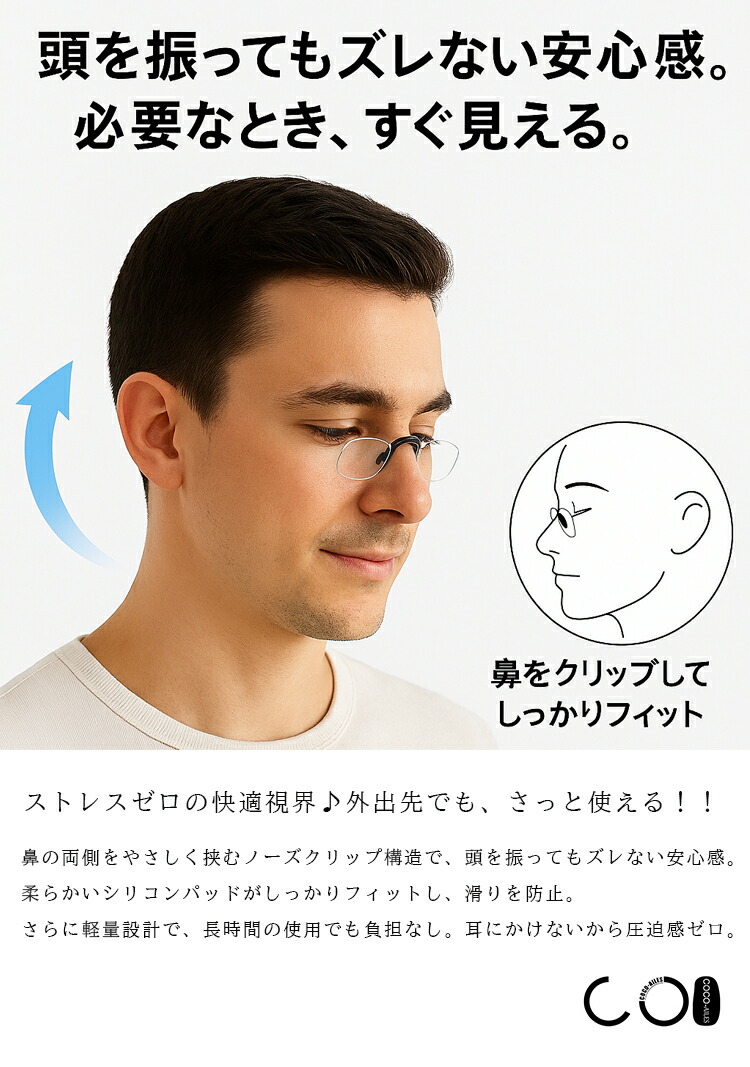 商品説明:鼻に掛けるだけでサッと使える、超コンパクト老眼鏡。 おしゃれなノーズクリップ式で、耳に負担がかからず快適。薄型カード型だから、お財布・ポケット・スマホケースにもすっきり収納できます。外出先での読書や細かい作業に大活躍。軽量めがね仕様で持ち運びもラクラク、ケース付きで携帯性も抜群。男性用・女性用どちらにも似合うシンプルデザインで、“見たい瞬間”をスマートにサポートするリーディンググラスです。