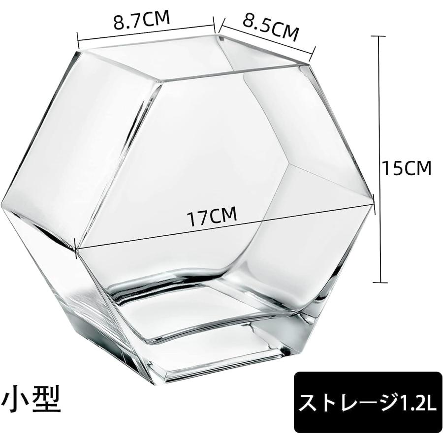 【サイズ 】六角形のガラス瓶 非常に厚いガラス 小サイズ 高さ15cm 口幅8.7cm 容量 約1.2リットル 中サイズ 高さ17.6cm 口幅10cm 容量 約2.2リットル 大サイズ 高さ22.5cm 口幅12.5cm 容量 約4.2リットル 口と底面は同じ大きさです。