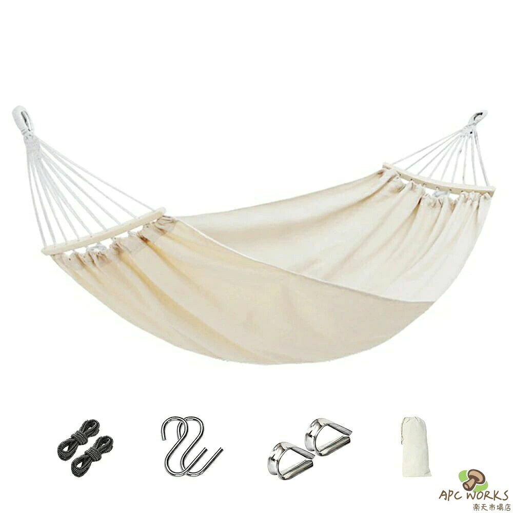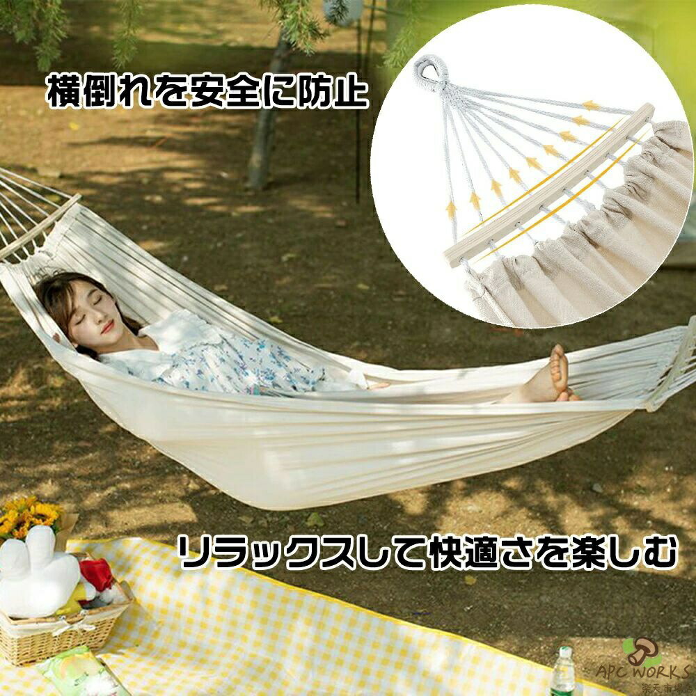 ハンモック シングル ダブル コンパクト 布製ハンモック 横転防止 ムーンバー付き 吊り下げ式ハンモック 通気性 室内 アウトドア バーベキュー 公園 庭 収納袋付き キャンプ