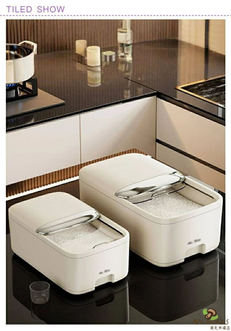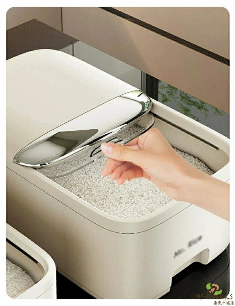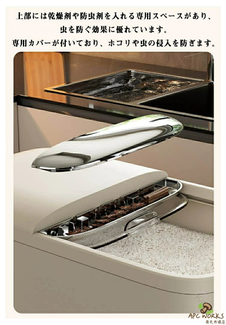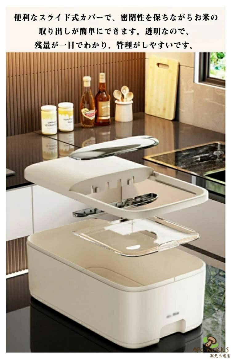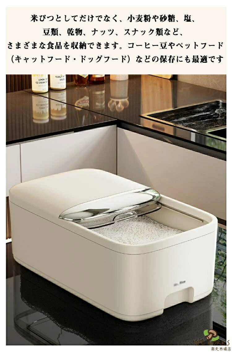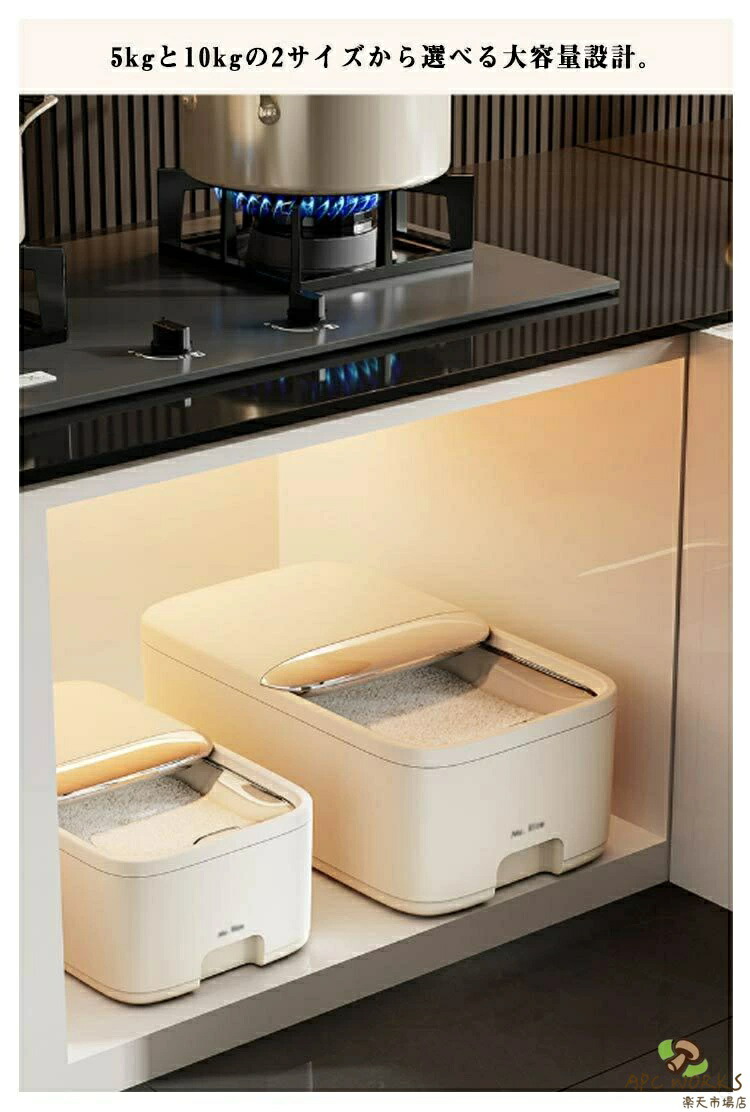 お米が取り出しやすいよう、スライド式のフタを採用しています。カップ付きの米びつです。5kgと10kgの2サイズから選べる大容量設計。計量カップ付きで、お米の計量が簡単にできます。上部には乾燥剤や防虫剤を入れる専用スペースがあり、虫を防ぐ効果に優れています。専用カバーが付いており、ホコリや虫の侵入を防ぎます。便利なスライド式カバーで、密閉性を保ちながらお米の取り出しが簡単にできます。透明なので、残量が一目でわかり、管理がしやすいです。米びつとしてだけでなく、小麦粉や砂糖、塩、豆類、乾物、ナッツ、スナック類など、さまざまな食品を収納できます。コーヒー豆やペットフード(キャットフード・ドッグフード)などの保存にも最適です。