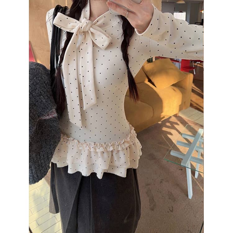 ドット柄 Tシャツ フレア裾 長袖 レディース レース裾 重ね着 カットソー きれいめ インナー トップス レイヤード 白 春 秋冬 着痩せ おしゃれ フェミニン リボン 大人可愛い シン カジュアル