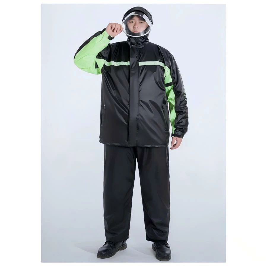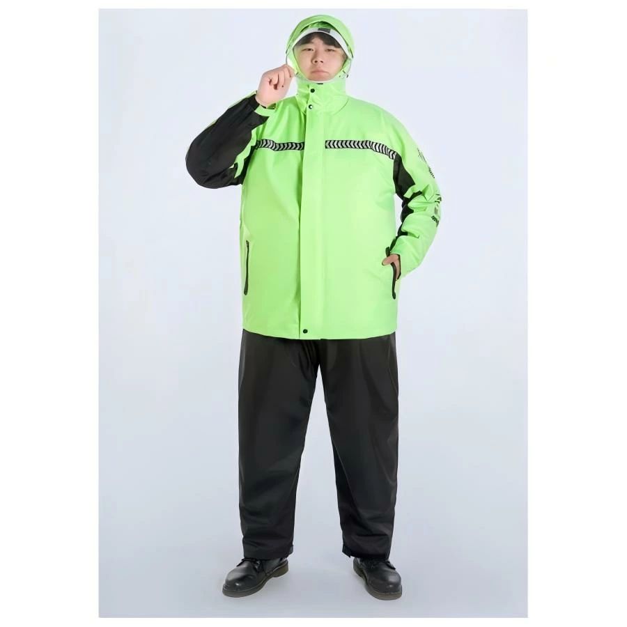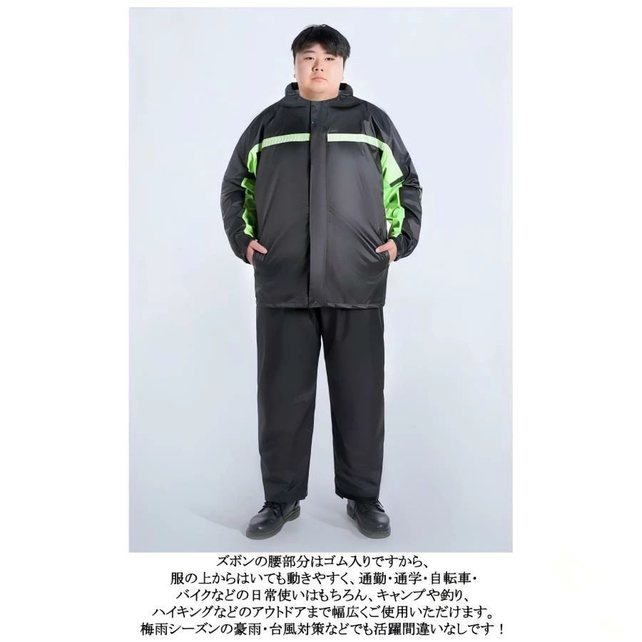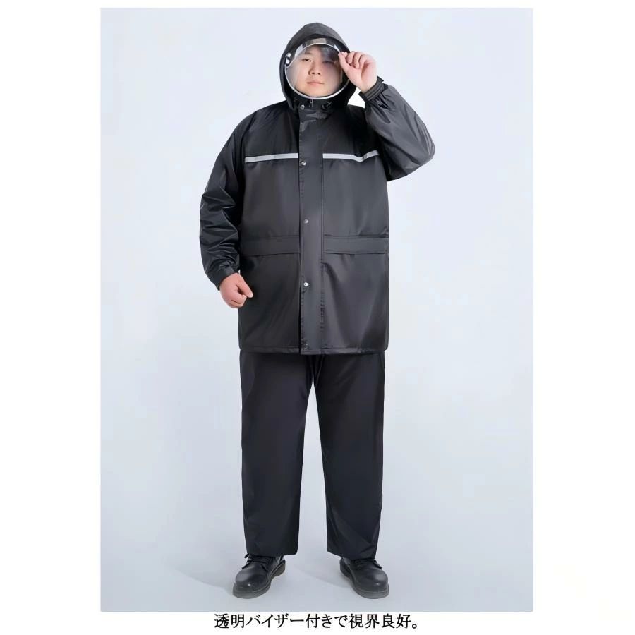 大きいサイズ!透明バイザー付きレインウェア上下セット防水力高め、丈夫で破れにくいレインウェア透明バイザー付きで視界良好。前後とも安全反射テープ付き。ズボンの腰部分はゴム入りですから、服の上からはいても動きやすく、通勤・通学・自転車・バイクなどの日常使いはもちろん、キャンプや釣り、ハイキングなどのアウトドアまで幅広くご使用いただけます。梅雨シーズンの豪雨・台風対策などでも活躍間違いなしです!