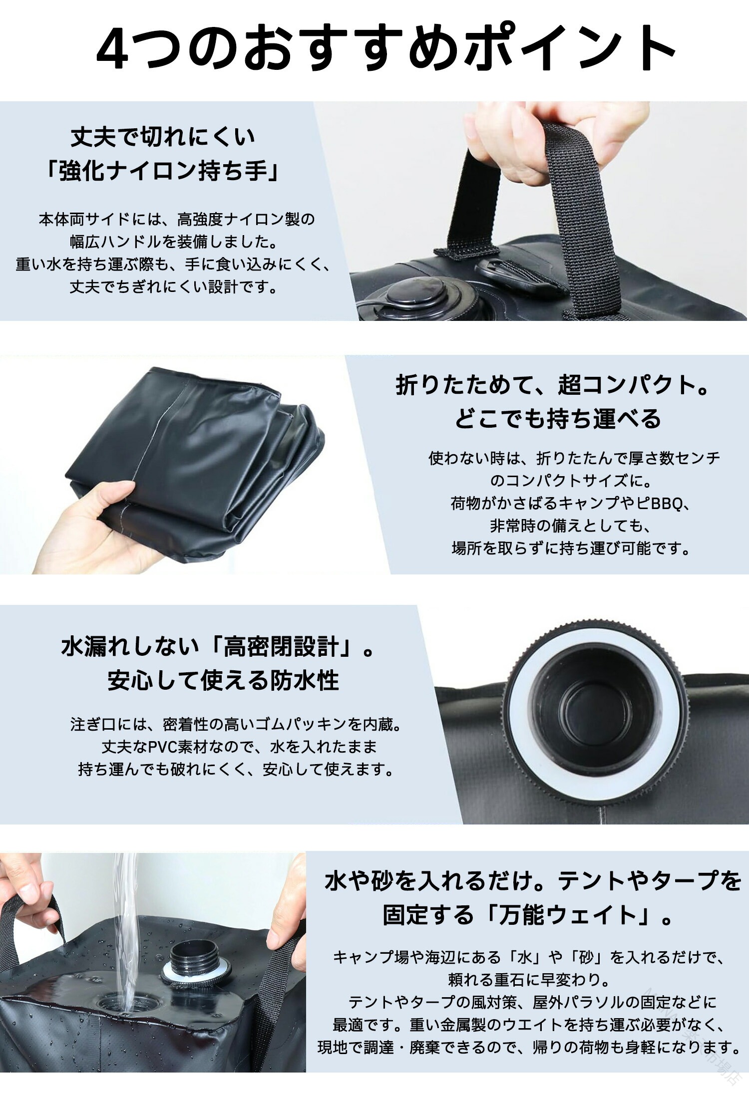 テント 用 ウエイト マルチ ウェイト 20KG 10KG 4個 セット 10L 20L 折りたたみ 収納 注水 式 持ち運び タンク 固定 バンド テープ 砂袋 砂 タープ 重 水