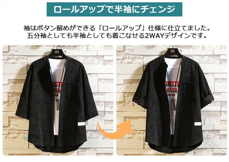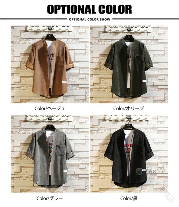 .メンズ 用 五分袖 シャツ は コーデュロイ 素材 で バンドカラー と スタンドカラー の デザイン が 特徴 です。ロールアップ 可能 な 半袖 タイプ の カジュアル シャツ で、大きい サイズ も 用意。40代 50代 の ファッション に 最適 な 夏物 トップス として 父の日 プレゼント にも 喜ばれます。。
