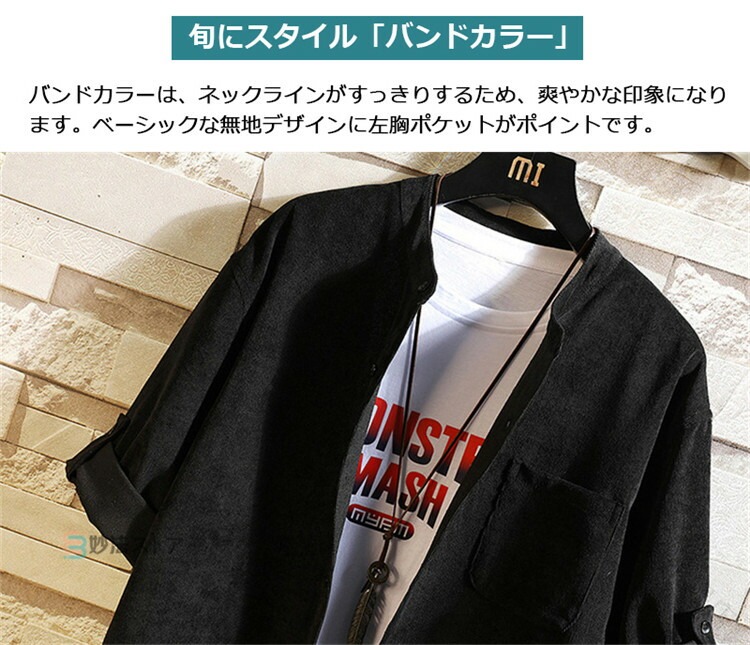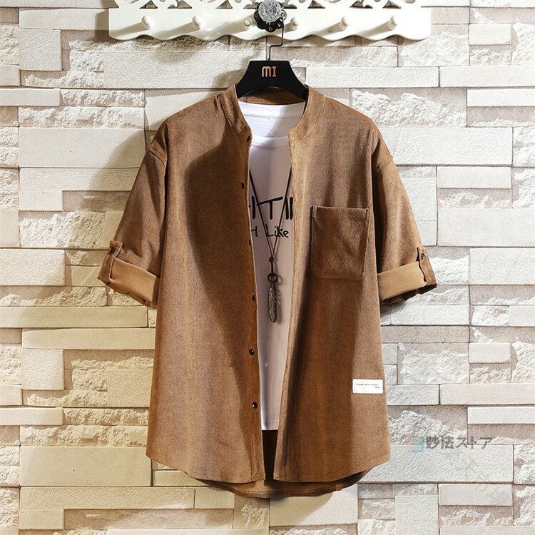 五分袖シャツ コーデュロイ シャツ メンズ 半袖シャツ ロールアップ カジュアルシャツ 無地 バンドカラー スタンドカラーシャツ アパレル 細畝コーデュロイシャツ シャツ ブラウス メンズ シャツジャケット 七分袖 5分袖 柔らかコーデュロイ生地を使用したバンドカラーシャツ。細畝の柔らかいコーデュロイ素材で、ほどよくリラックスした雰囲気で着用することができます。襟元はバンドカラー仕様で、ネックラインがすっきりするため、爽やかな印象になります。ベーシックな無地デザインに左胸ポケットがポイントです。