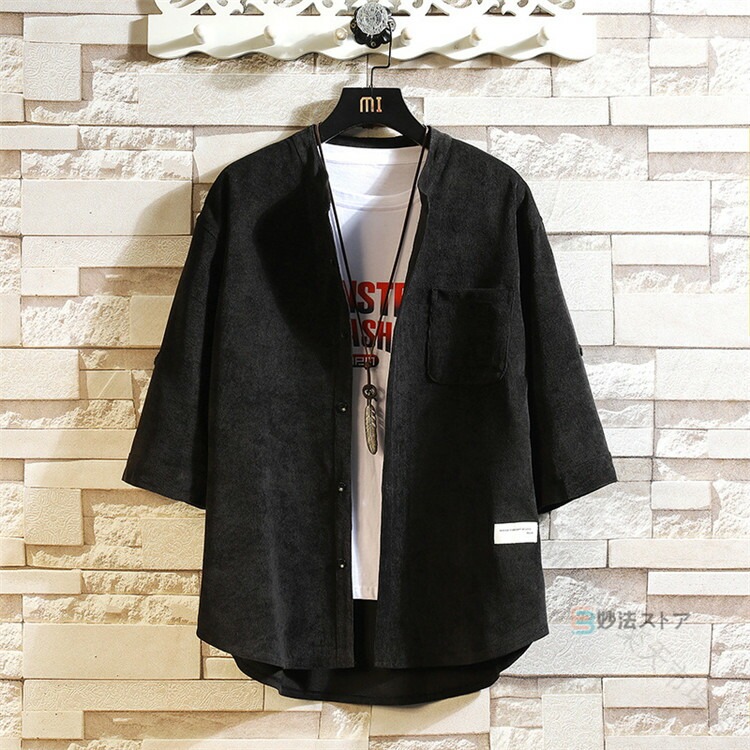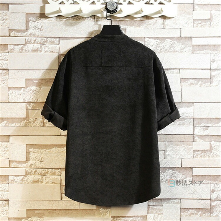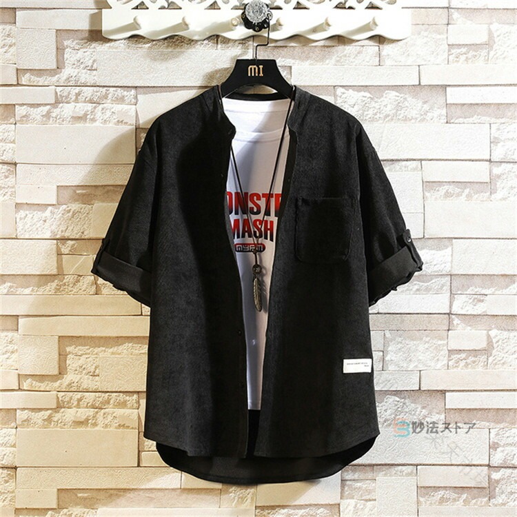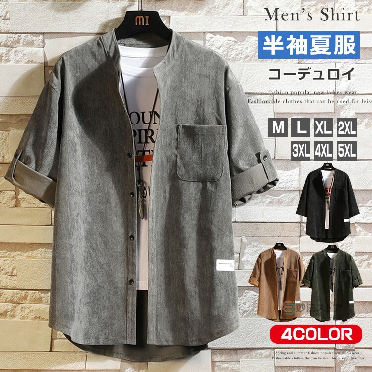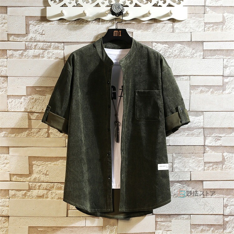 シャツ メンズ 五分袖 5分袖 コーデュロイ バンドカラー スタンドカラー ロールアップ カジュアル 無地 半袖 サイズ トップス 40 大きい