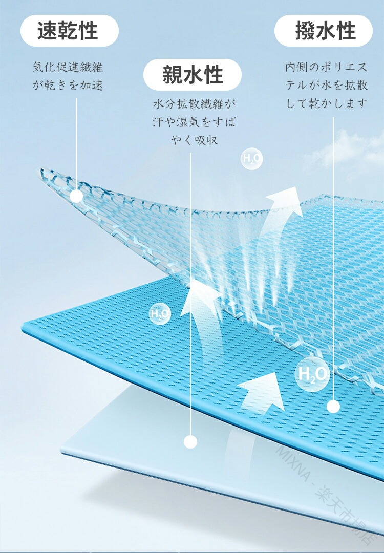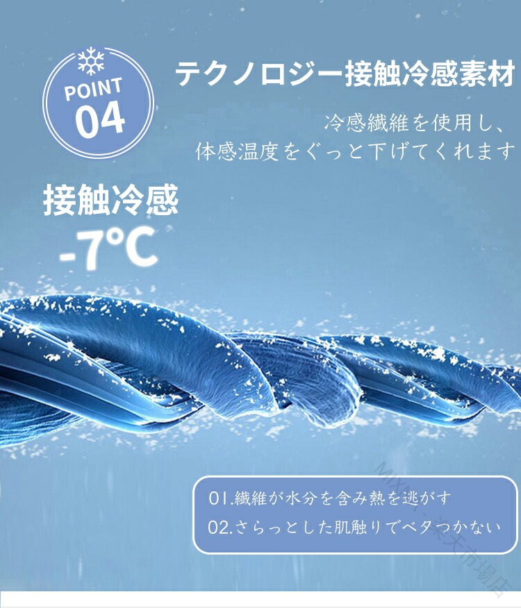 繊維に含んだ水分が熱を吸収し、肌に触れた瞬間冷感。汗もすばやく吸収・拡散し、暑い日でもさらっと快適な着心地をキープします。