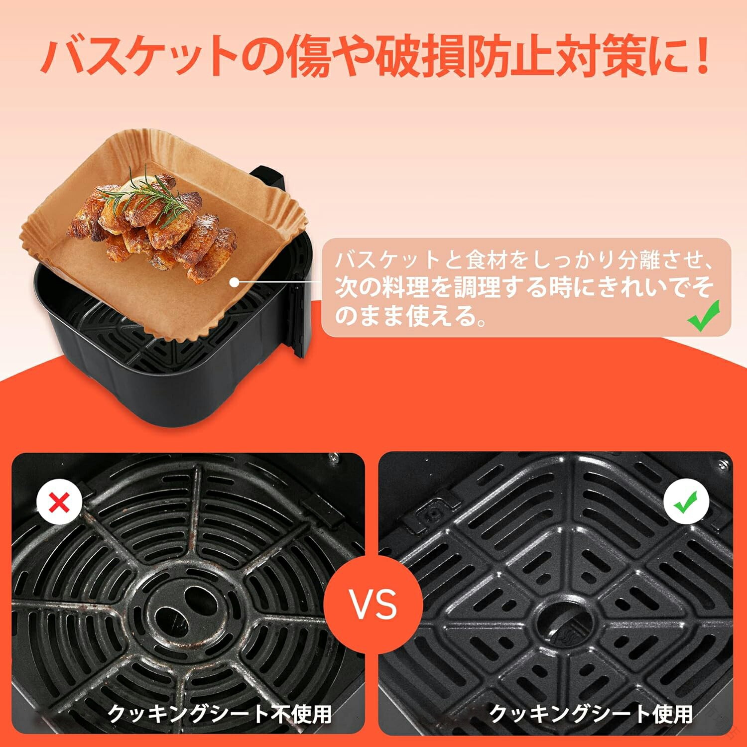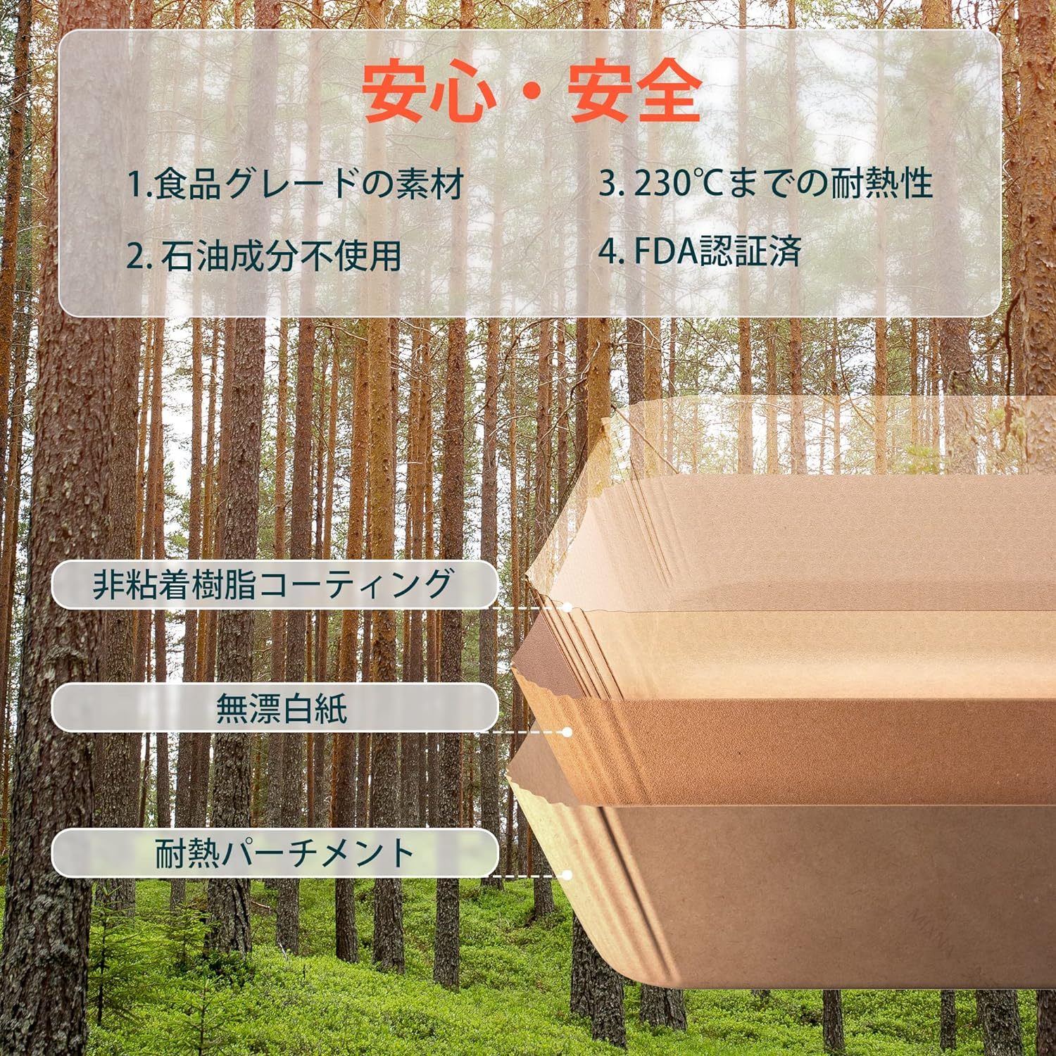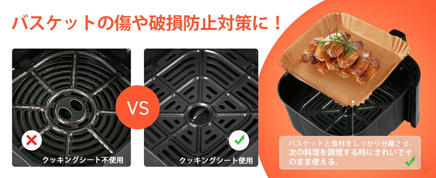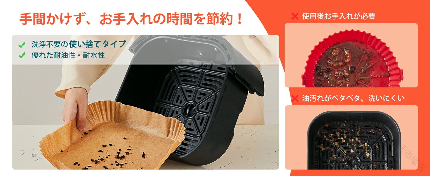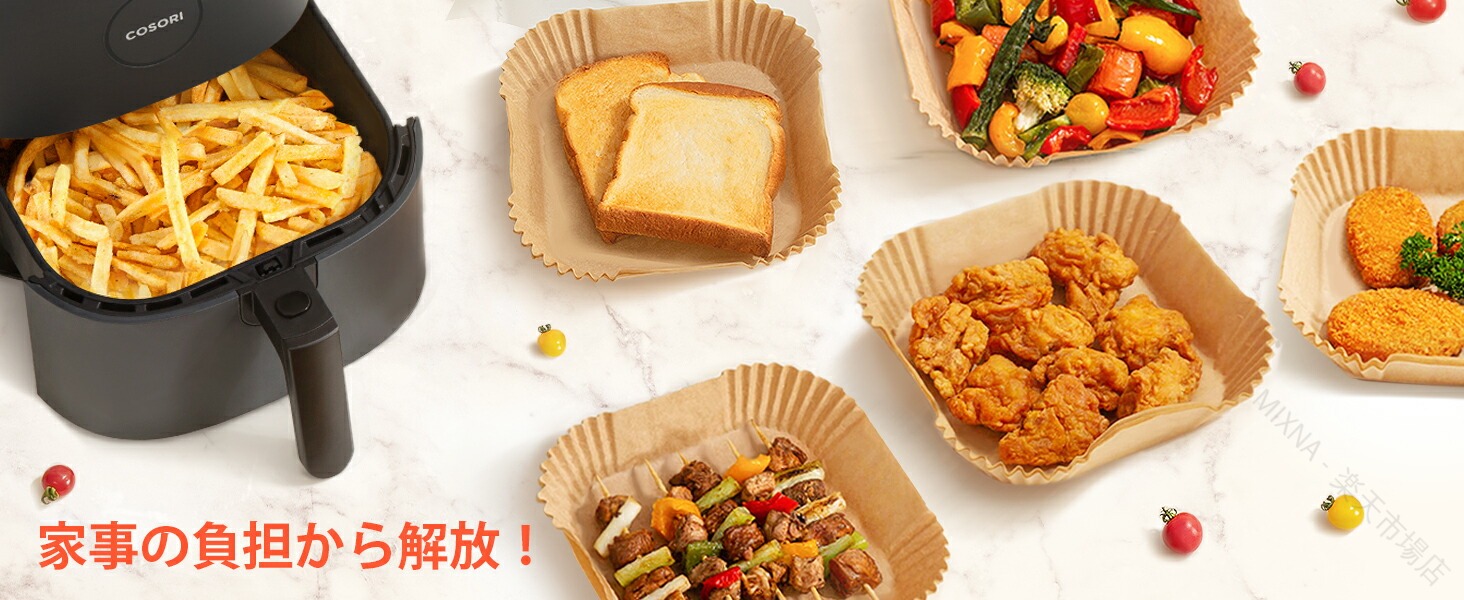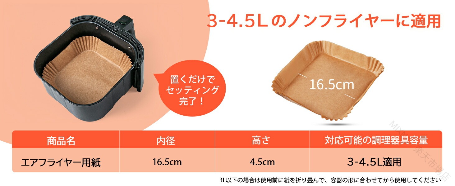 .エアフライヤー 用紙 は 3-4.5L 適用 の 丸形 内径 16cm と 四角形 内径 16.5cm の 100枚 セット です。スクエア 型 の クッキング シート で 天ぷら 敷紙 や 油紙 として 防水 耐油 性 と 230℃ の 耐熱 性 を 備え、揚げ物 や ケーキ 作り に 使い捨て で 便利 に ご利用 いただけます。キッチン 専用 で ノンフライヤー 電子レンジ オーブン 蒸し器 でも 使用 可能 な 多用途 紙 です。。