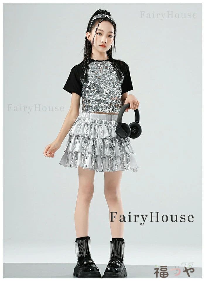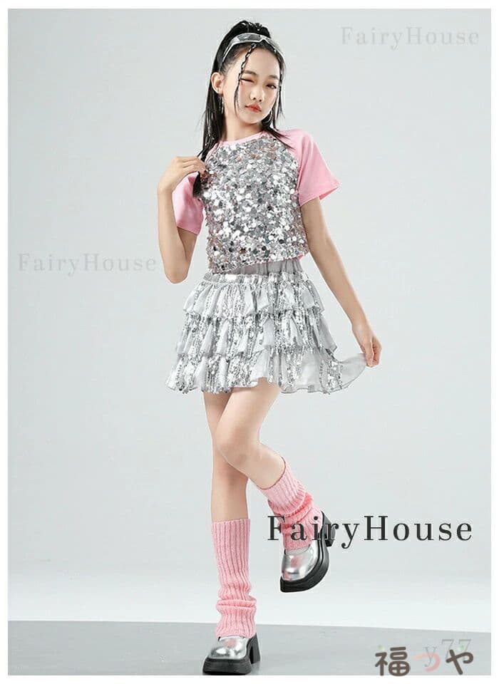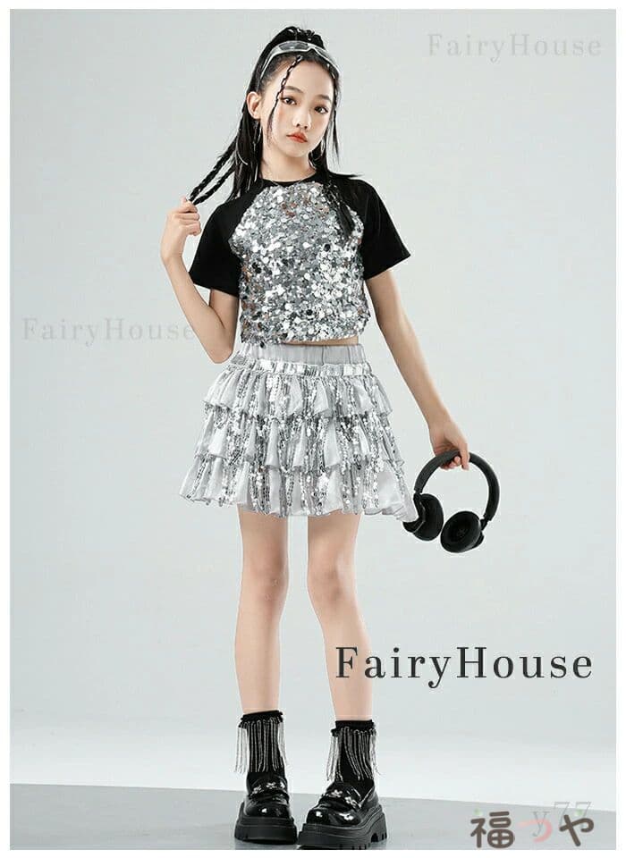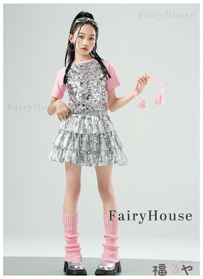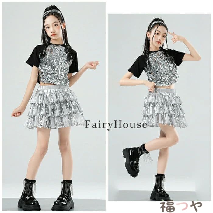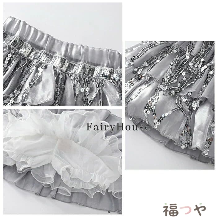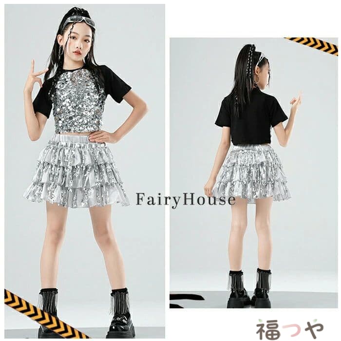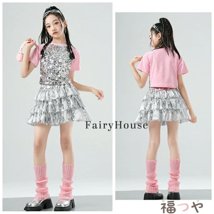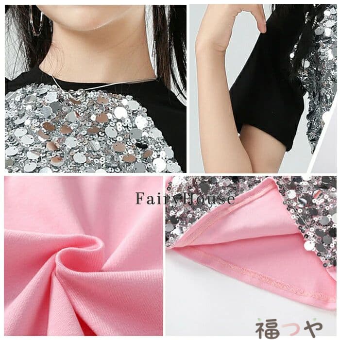 スパンコール スカート キッズダンス衣装 女の子 キラキラ ダンススカート 舞台 演出服 ステージ衣装 ジャズダンス 半袖 黒 粉 Tシャツ 子供服 ダンス服 チアリーダー 応援団 演 団体服