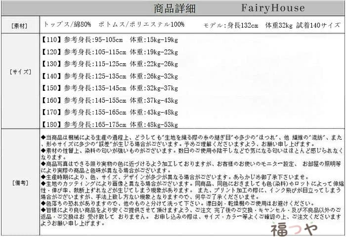 素 材:トップス/綿80% ボトムス/ポリエステル100%