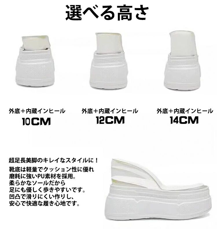 アウトソールとインソールを合わせて、高さ約10/12/14cmからお選びいただけます! 自然とスタイルアップを叶えてくれます!超々ハイヒールで身長が10/12/14cm以上アップ!そして脚長効果も! 高いヒールなのに安定感は抜群です。
