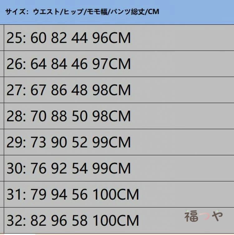 サイズ:ウエスト/ヒップ/モモ幅/パンツ総丈/CM