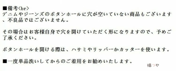 ジーパンやデニムなどのボトムスはボタンホールに穴が空いていない商品もございます、不良品ではございません。