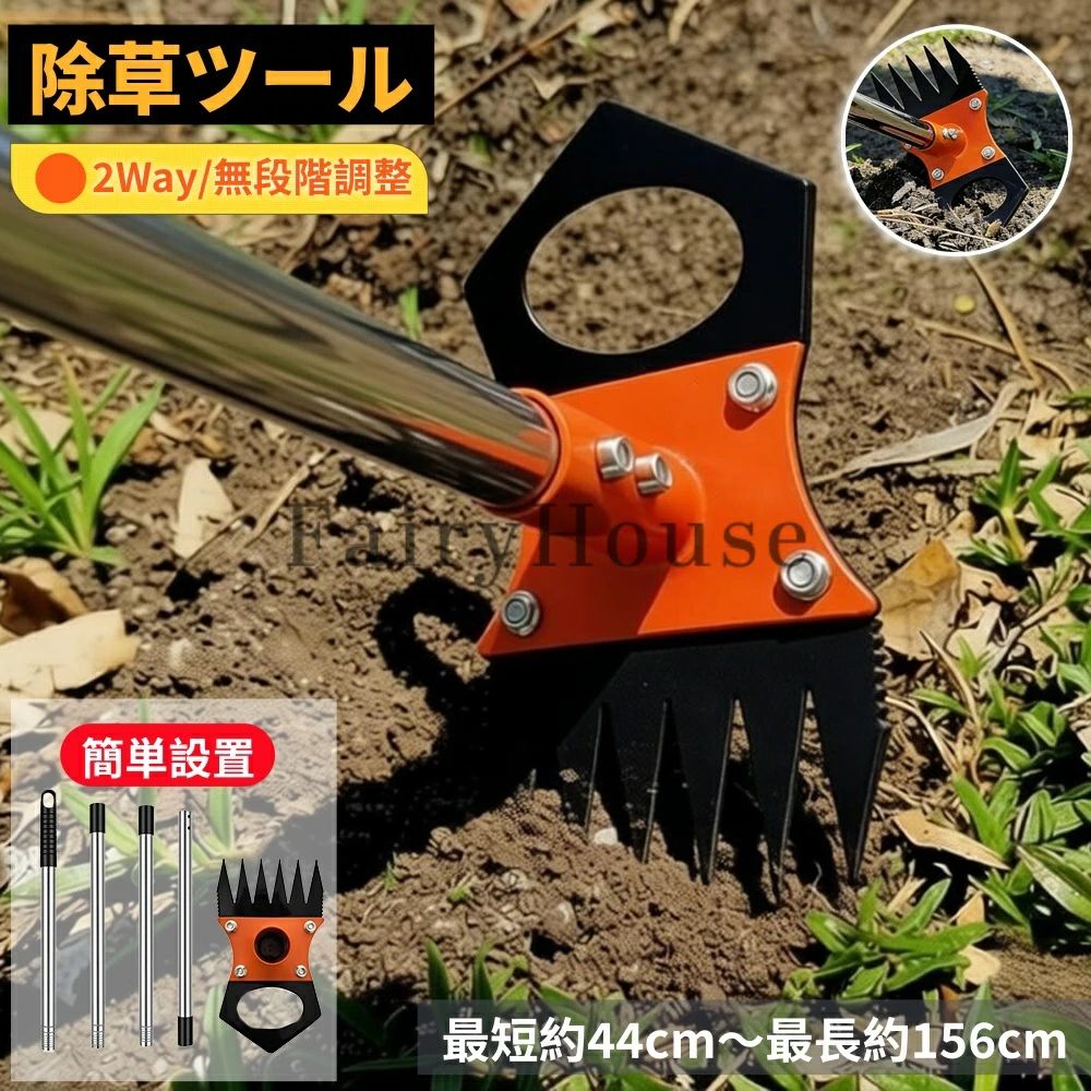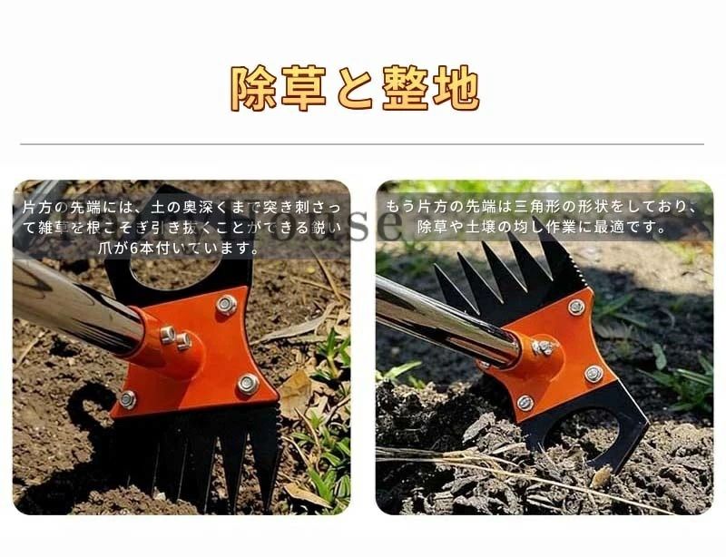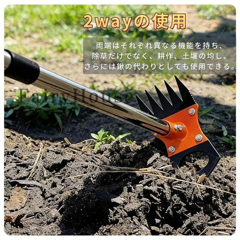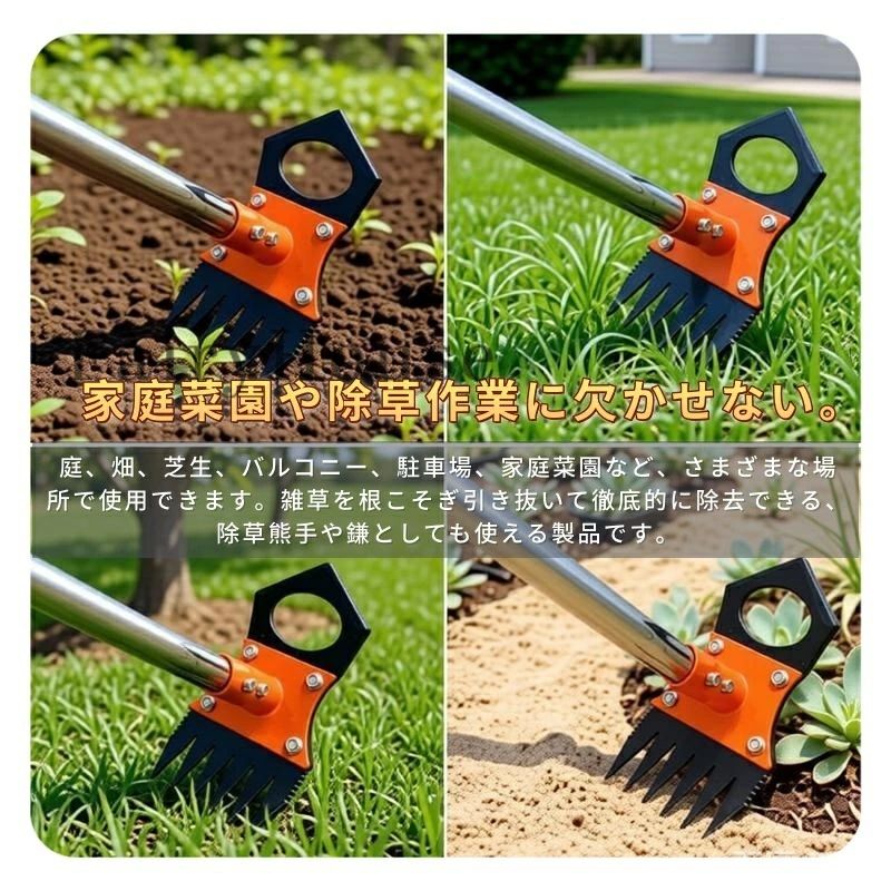 草取りや雑草抜きはもちろん、土壌の耕しや整地、くわの代用としても使用可能。庭先や畑、芝生、ベランダ、駐車場、家庭菜園など、多様なシーンで活躍します。根っこから雑草を除去したい方や、草刈り器具・くわをお探しの方に最適です。