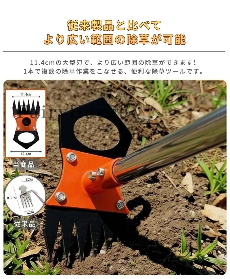 先端には6本の鋭い爪を装備し、地中深くまで届いて雑草をしっかり根こそぎ除去。反対側は三角形状の先端で、草削りや土の整地に最適。従来品の8cmから11.4cmへとサイズアップし、一度に除草できる面積が広がり作業効率が向上。多機能で扱いやすい除草器具です。