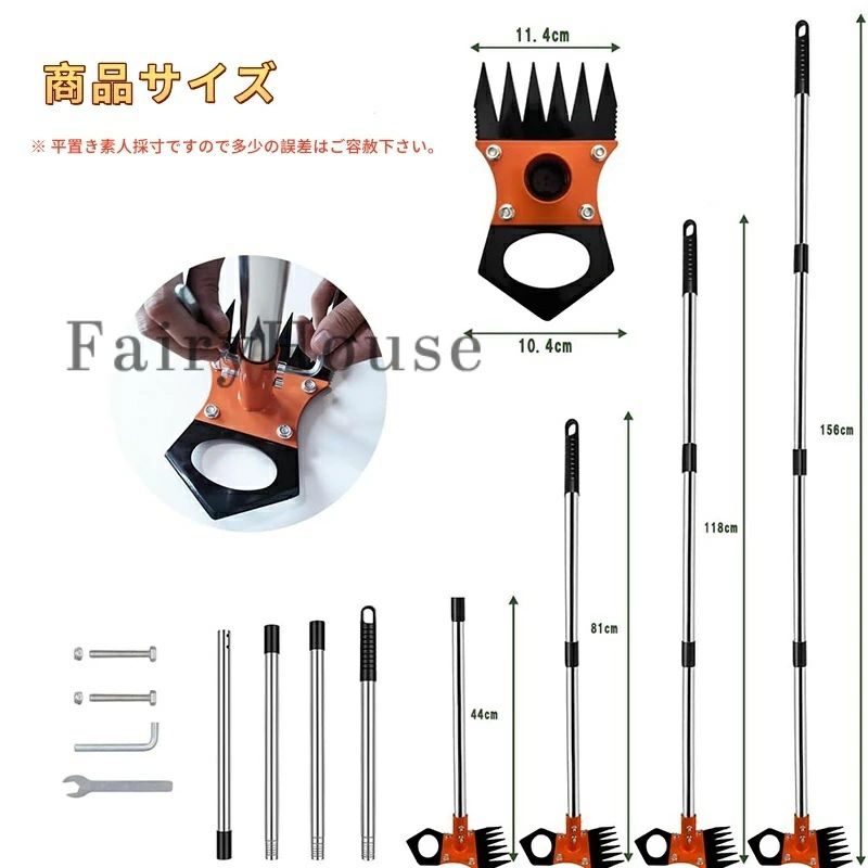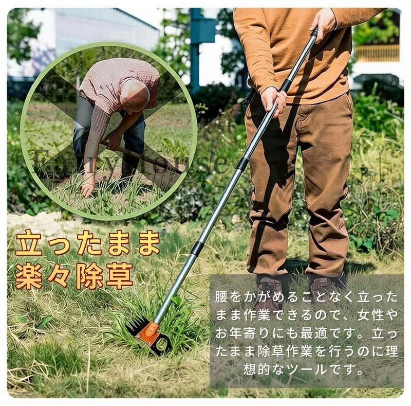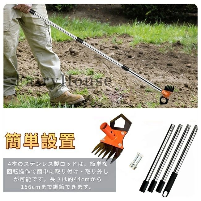 4本のステンレスポールは回すだけで簡単に脱着可能。最短約44cmから最長約156cmまで無段階調節できるため、自分の身長に合わせて立ったまま快適に作業できます。女性や高齢者にも優しい、立ち姿勢で使える草抜き道具として重宝します。