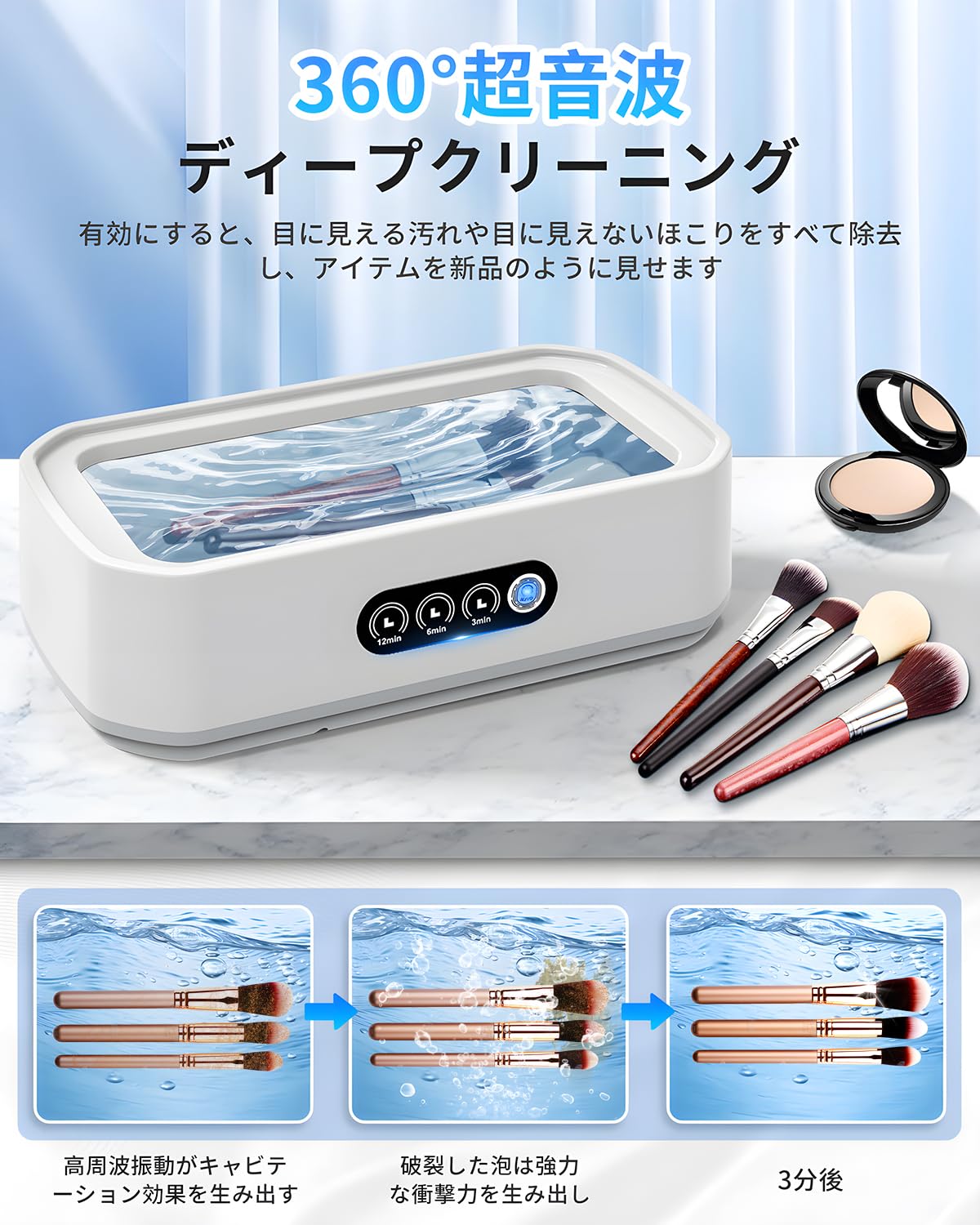 【3段階調節、きれいに洗浄します】超音波洗浄機は3段階タイマー機能(3min・6min・12min)を搭載し、汚れ具合や使用シーンによって洗浄時間を設定します。時間の節約の上、よりきれいに洗浄できます。