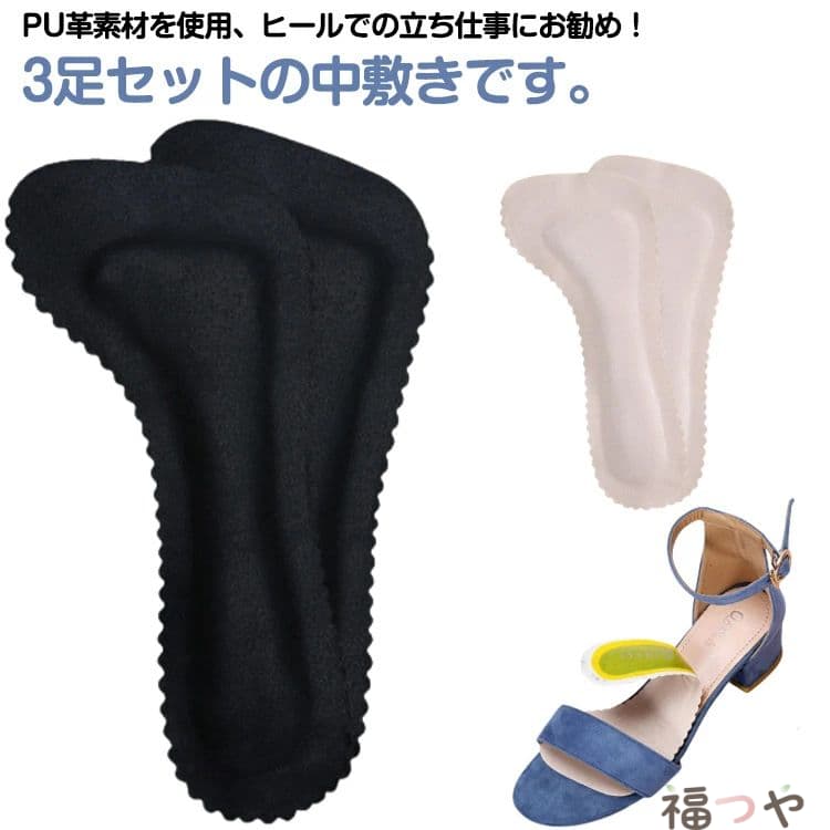 PU革素材を使用、ヒールでの立ち仕事にお勧め!3足セットの中敷きです。