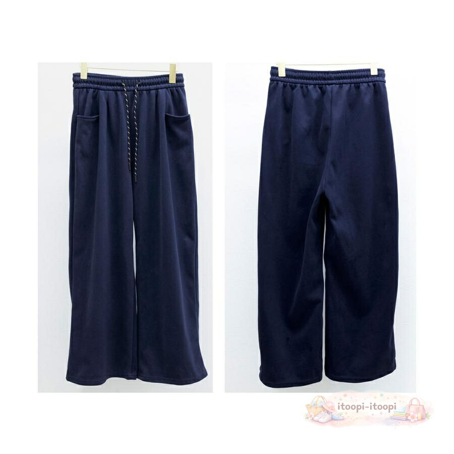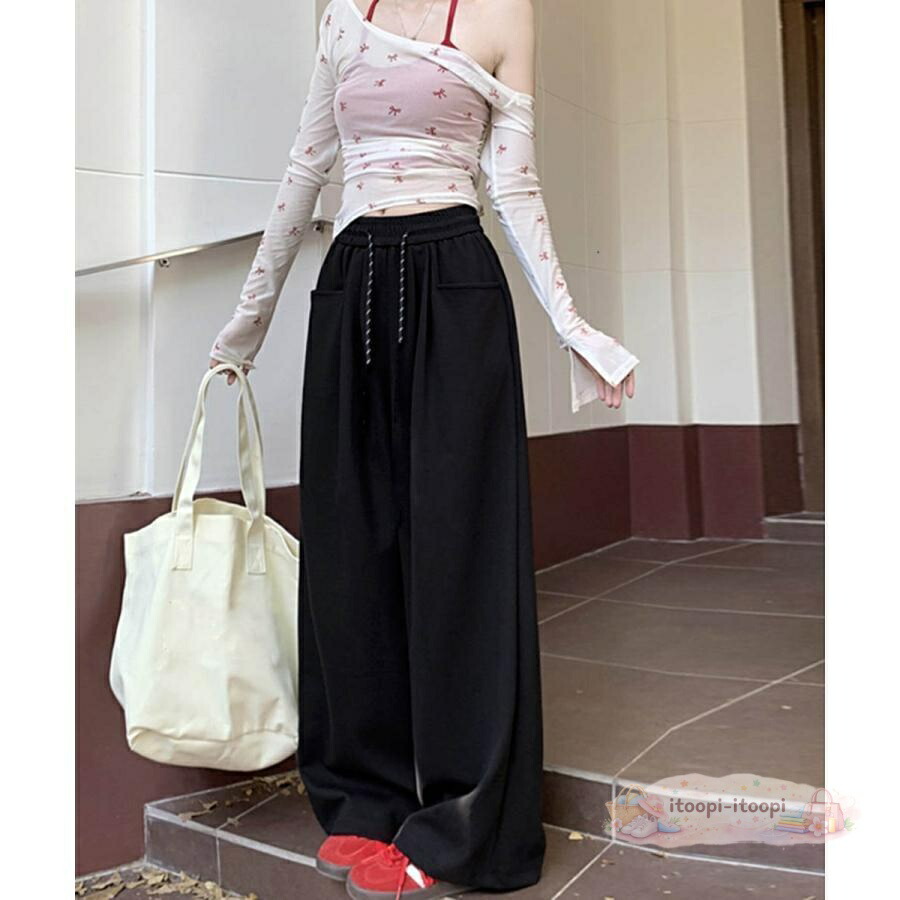 リラックス感のあるワイドシルエットと、ウエストのドローストリングデザインが特徴のカジュアルボトムス