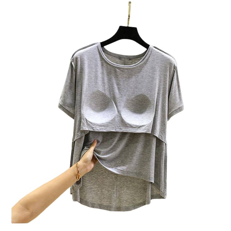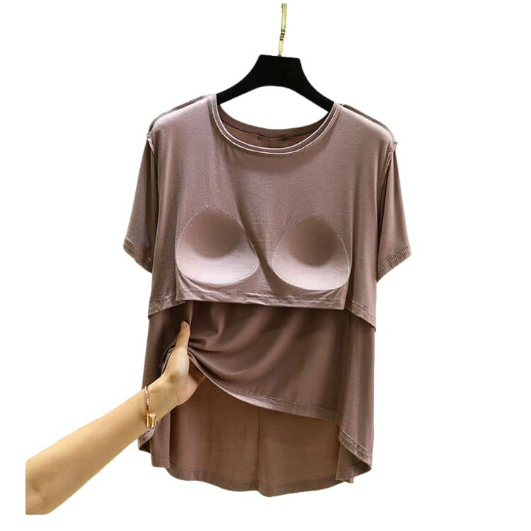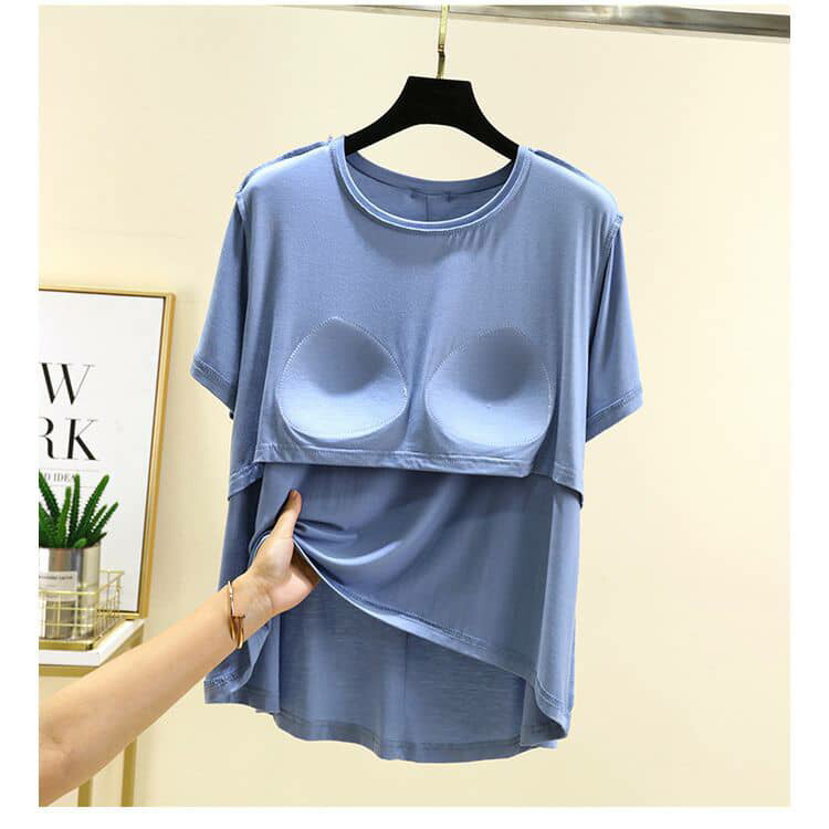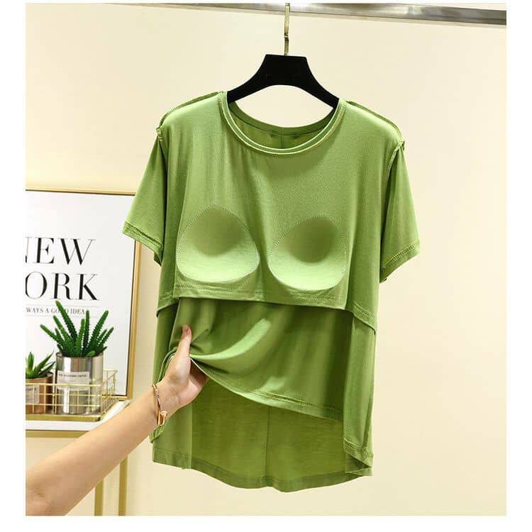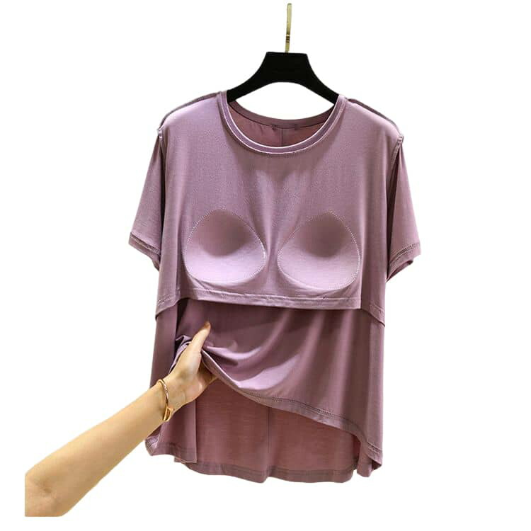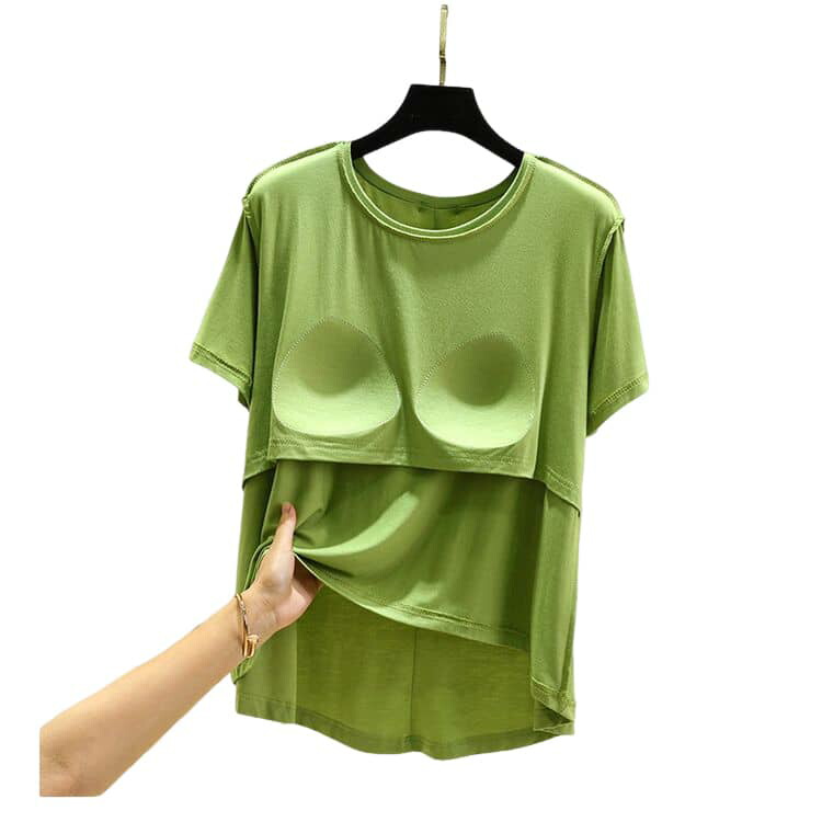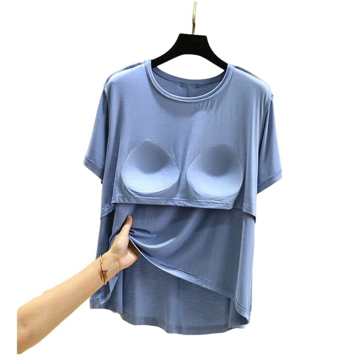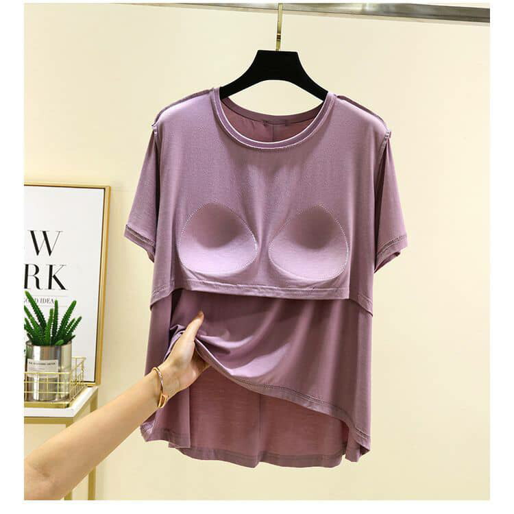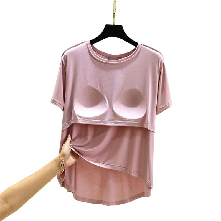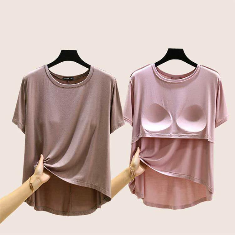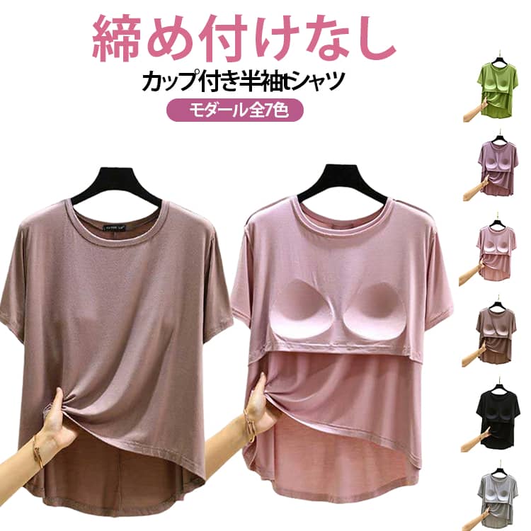 締め付けなし 半袖Tシャツ パット付 ラウンドネック アンダーフリー ゴムなし ブラトップ 半袖 tシャツ 部屋着 締め付けない 前のみ パッドのみ 固定 カップ付き インナー アウター ルームウェア