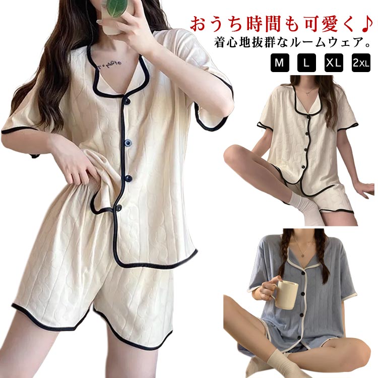 伸縮性 夏 パジャマ ルームウェア レディース 前開き 半袖 上下セット セットアップ かわいい 半袖パジャマ 可愛いパジャマ 部屋着 ショートパンツ ストレッチ ナイトウェア 無地