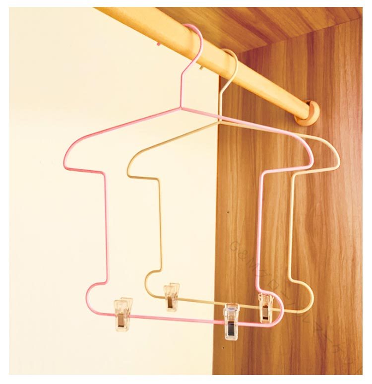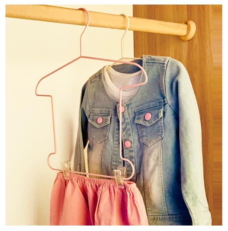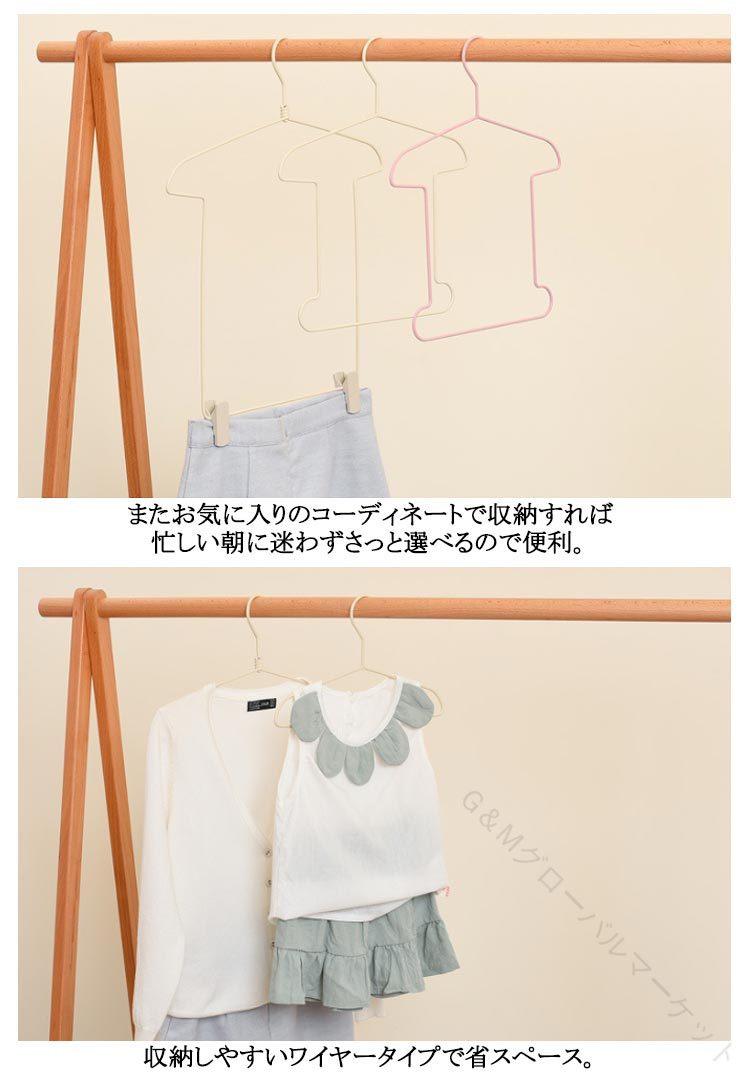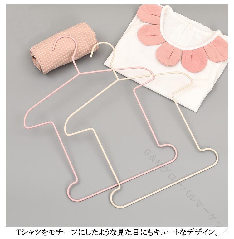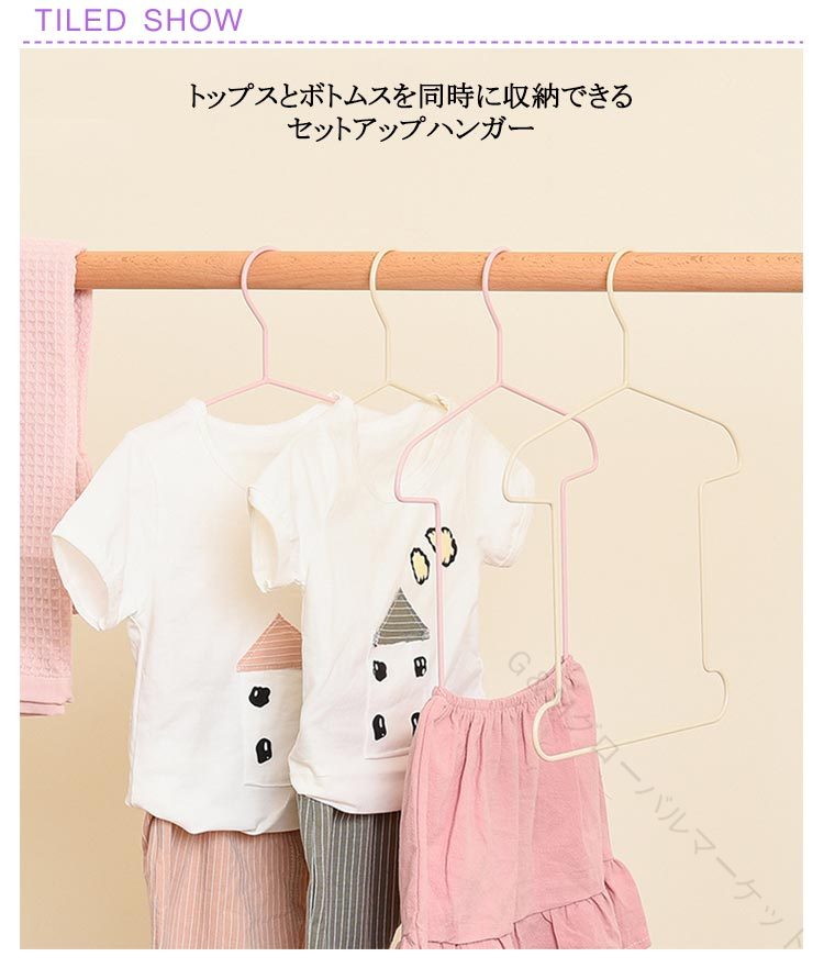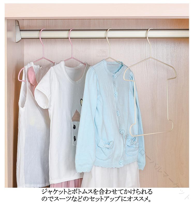 【80cm-150cm子供用】【10本セット】【収納しやすいワイヤータイプで省スペース。】トップスとボトムスを同時に収納できるセットアップハンガー。Tシャツをモチーフにしたような見た目にもキュートなデザイン。ジャケットとボトムスを合わせてかけられるのでスーツなどのセットアップにオススメ。またお気に入りのコーディネートで収納すれば忙しい朝に迷わずさっと選べるので便利。収納しやすいワイヤータイプで省スペース。
