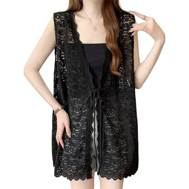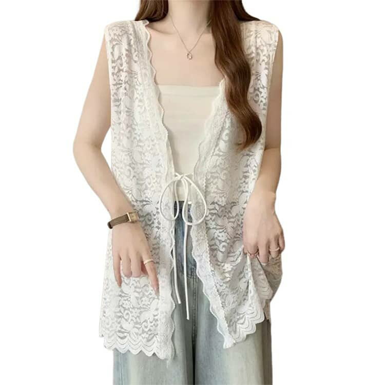 透け感のある花柄レース編みが目を引くレースベストです。