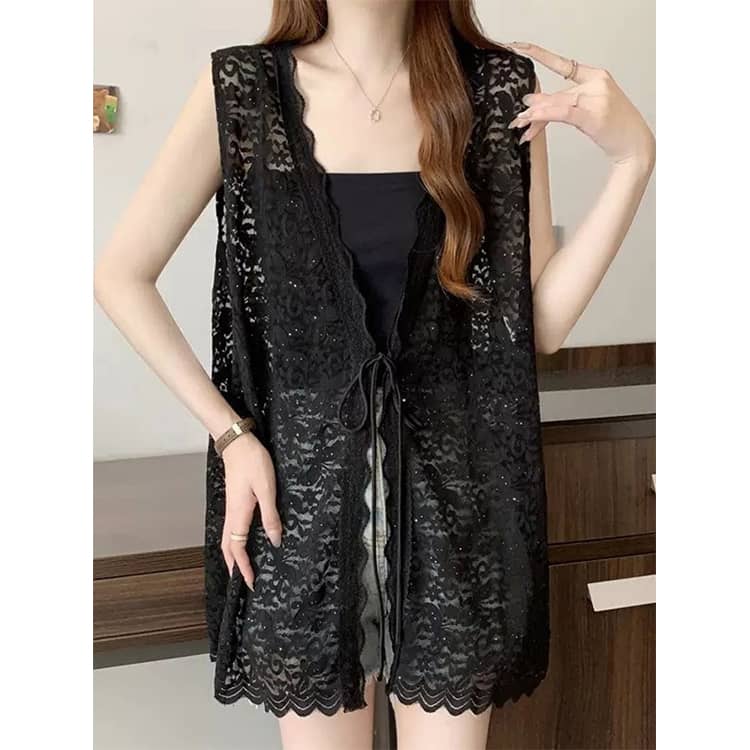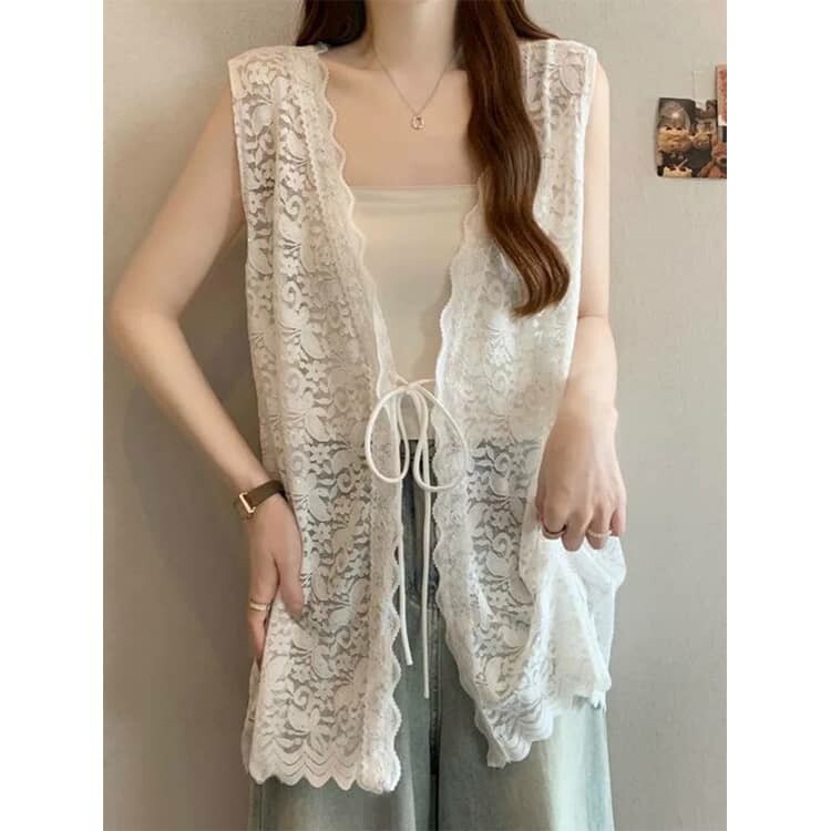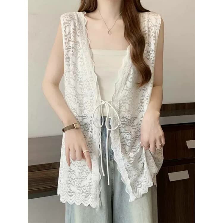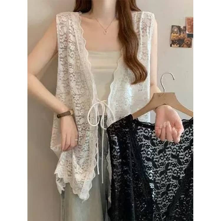 レーストップス シースルージレ レースベスト トップス コーデ 白 ベスト レイヤード風 レディース 春夏 春 vネック 黒 総レース レースベストジレ 羽織り レースベストレディース