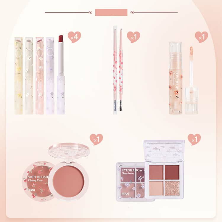 完璧な化粧品セット: 口紅、チーク、アイシャドウ、コンシーラー、アイブロウペンシルが含まれています。