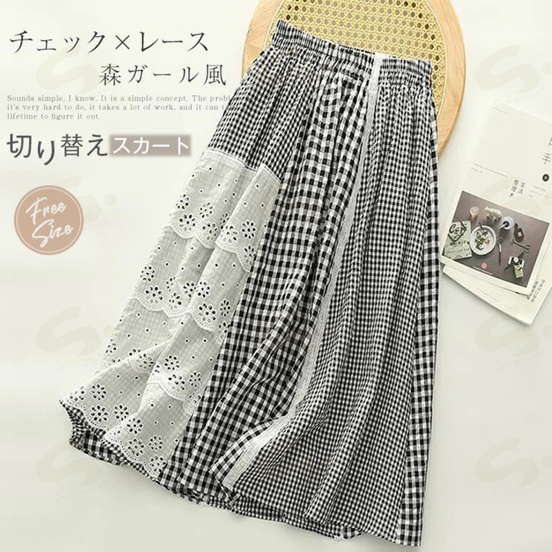 スカート 切り替えスカート レディース ロングスカート ロング丈 切り替え チェックスカート レース チェック柄 ウエストゴム Aライン フレア 森ガール ボトムス 体型カバー おしゃれ 着 ゆったり