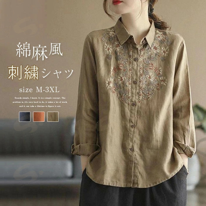 シャツ 刺繍シャツ レディース 春秋 シャツブラウス ブラウス 長袖 刺繍 綿麻風 綿麻風シャツ ナチュラル トップス レトロ ゆったり 体型カバー 着 せ オフィス 大人 可愛い お洒落 柔らかい
