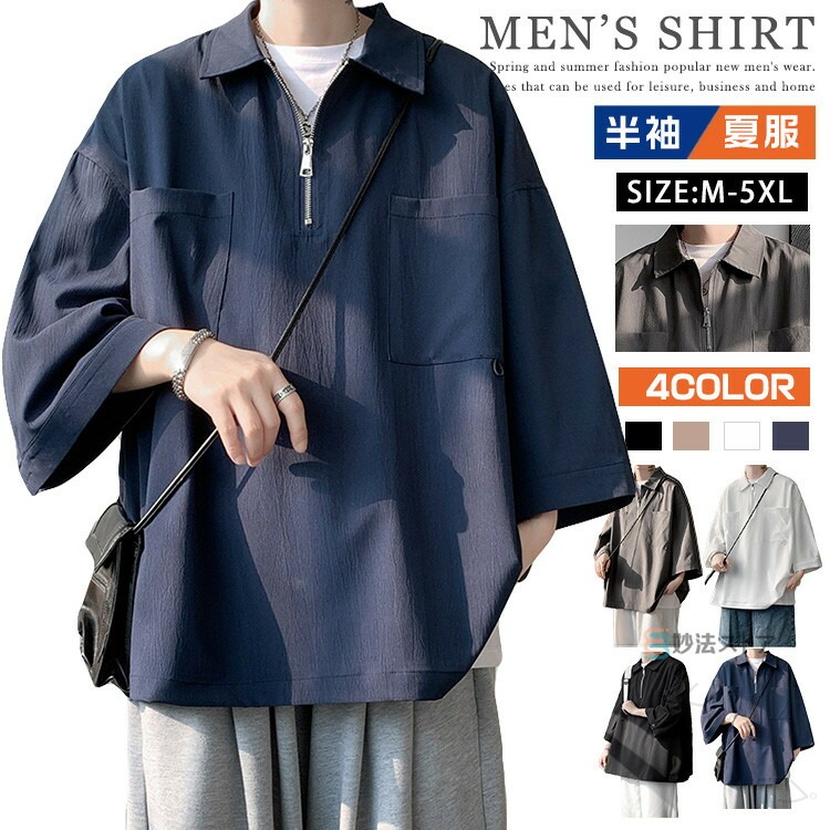 メンズ ジップアップ シャツ 5分袖 プルオーバーシャツ ハーフジップ ジップシャツ ポロシャツ 五分袖 七分袖 無地 ゆったり カジュアルシャツ ポロ風 襟付きTシャツ 大きいサイズ ゴ ジップポロ