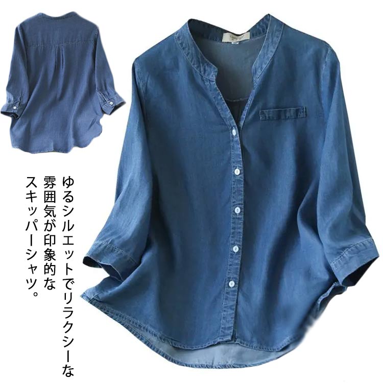 シャツ 夏 デニム 七分袖 レディース デニムシャツ スキッパーシャツ チュニック 長袖 シルエットシャツ スタンドカラー ラウンドテール Vネック ロング丈 春 秋 ブラウス トップス