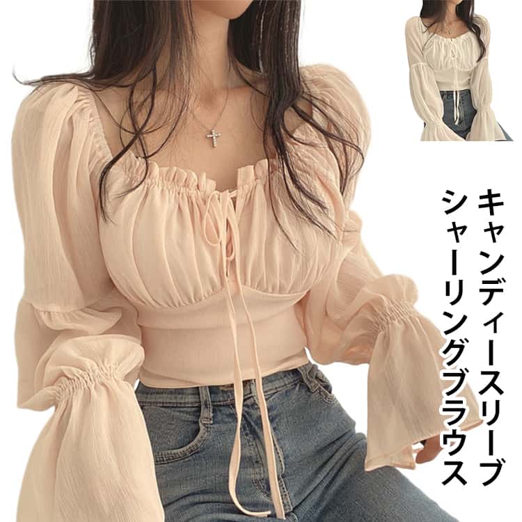 長袖 シャツ ブラウス スクエアネック シャーリング ギャザー シャツブラウス レディース 長袖ブラウス おしゃれ キャンディースリーブ 春 夏 秋 トップス ビスチェ風 長袖シャツ リボ ショート丈