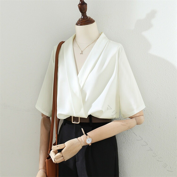 レディース ブラウス カシュクールブラウス トップス シャツ プルオーバー Vネック 半袖 五分袖 半そで 体型カバー 大きいサイズ ゆったり 夏 白 ホワイト M L LL S