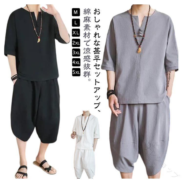 涼感 パジャマ セットアップ 綿 麻 7分丈 半袖 シャツ サルエルパンツ メンズ 部屋着 おしゃれ