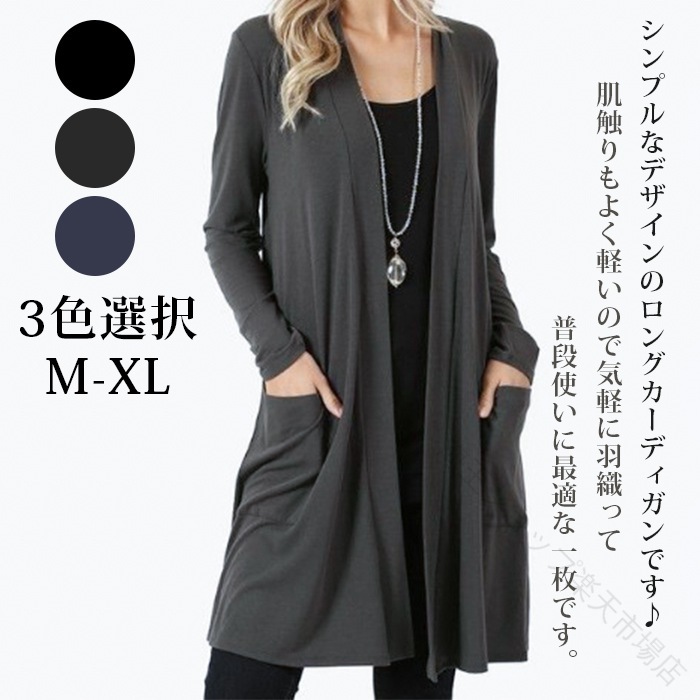 カーディガン レディース ロングカーディガン ロング 長袖 シンプル 無地 ポケット 軽い 着心地 きれいめ 大人 カジュアル 秋 20代 30代 40代 M L グレー 黒 ネイビー XL