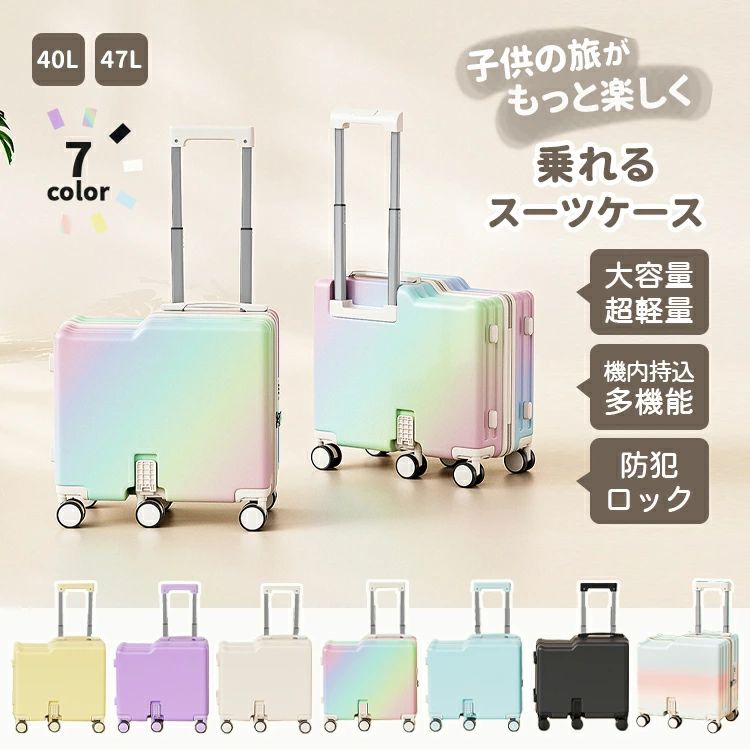 静音 キッズキャリー キッズトラベル 子供が乗れるキャリーケース ホワイト メッシュポケット 虹色 子供用 ブルー 40L パープル ブラック 子供が乗れるスーツケース ステップ付き 折り畳 イエロー