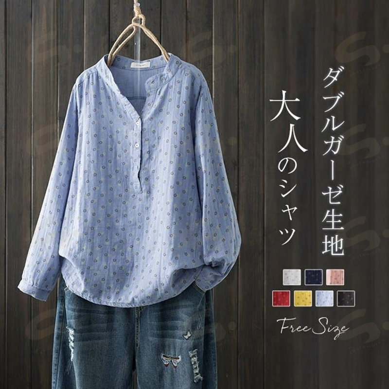 ダブルガーゼ シャツ ブラウス シャツブラウス コットン 綿100% レディース 春 夏 秋 花柄 ネック トップス 総柄 プルオーバー ガーゼ 綿100% カジュアル ガー