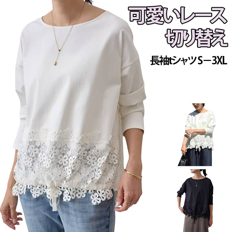 レディースカットソー 長袖 裾レース切り替え プルオーバー ゆったり カットソー 春 トップス tシャツ シンプル フラワー レース 切り替え 長袖tシャツ 黒 クルーネック 春服 白