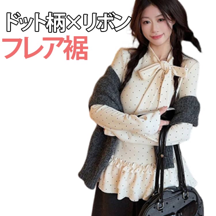 ドット柄 Tシャツ フレア裾 長袖 レディース レース裾 重ね着 カットソー きれいめ インナー トップス レイヤード 白 春 秋冬 着痩せ おしゃれ フェミニン リボン 大人可愛い シン カジュアル